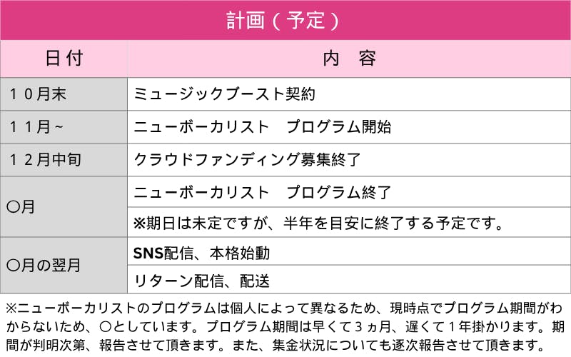 このプロジェクトでは、MUSIC BOOSTと契約し、プロのボーカリストとしてのキャリアをスタートすることを目指しています。