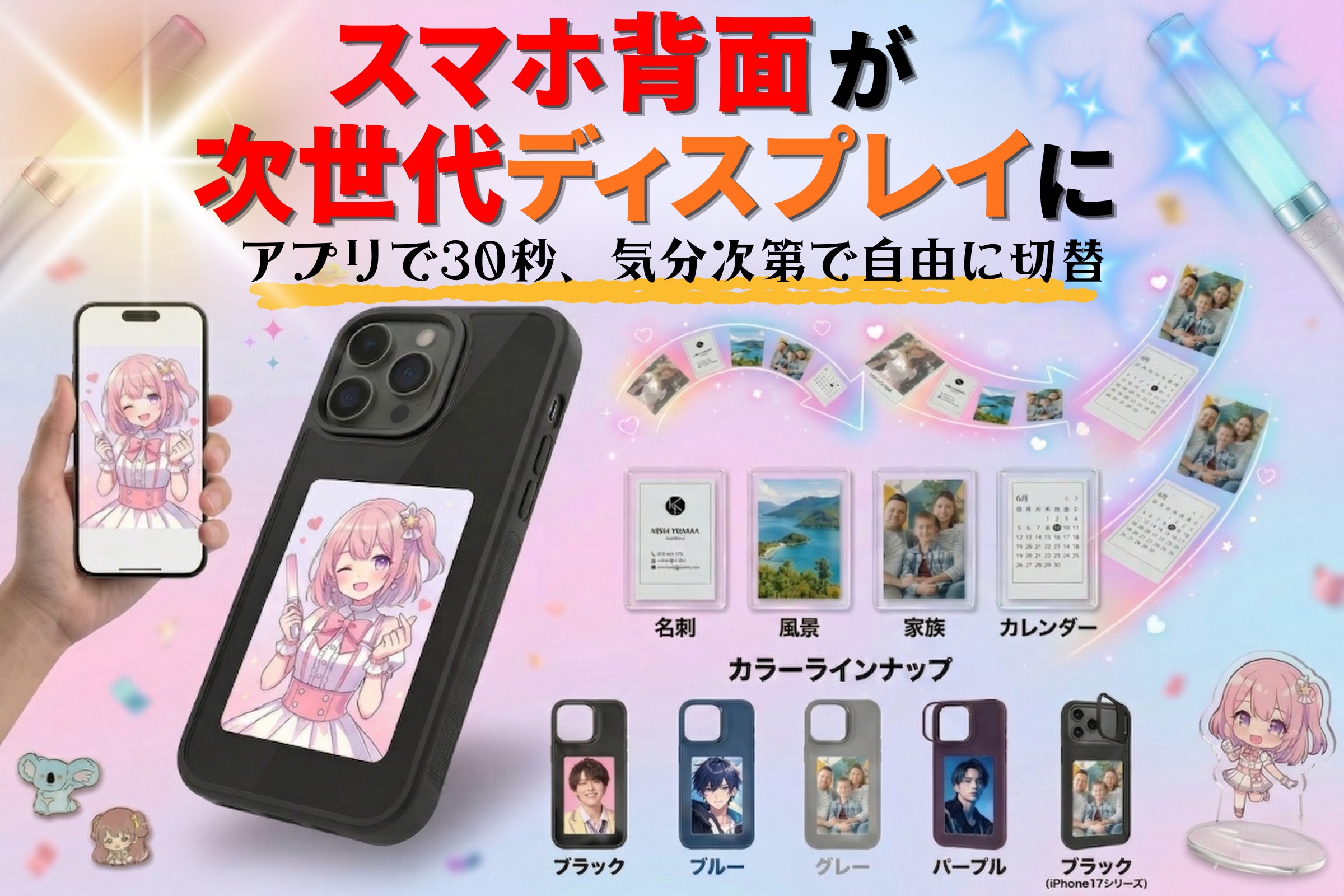 このスマホケースは、スマホ背面のデザインをアプリで自由に切り替えられる、新しい感覚のアイテムです。