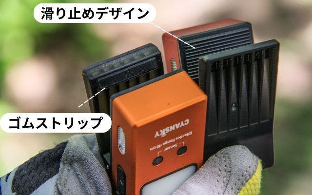 この厚みと滑り止めデザインにより、帽子のツバやチェストストラップなど様々なものを挟むことができます(写真3)