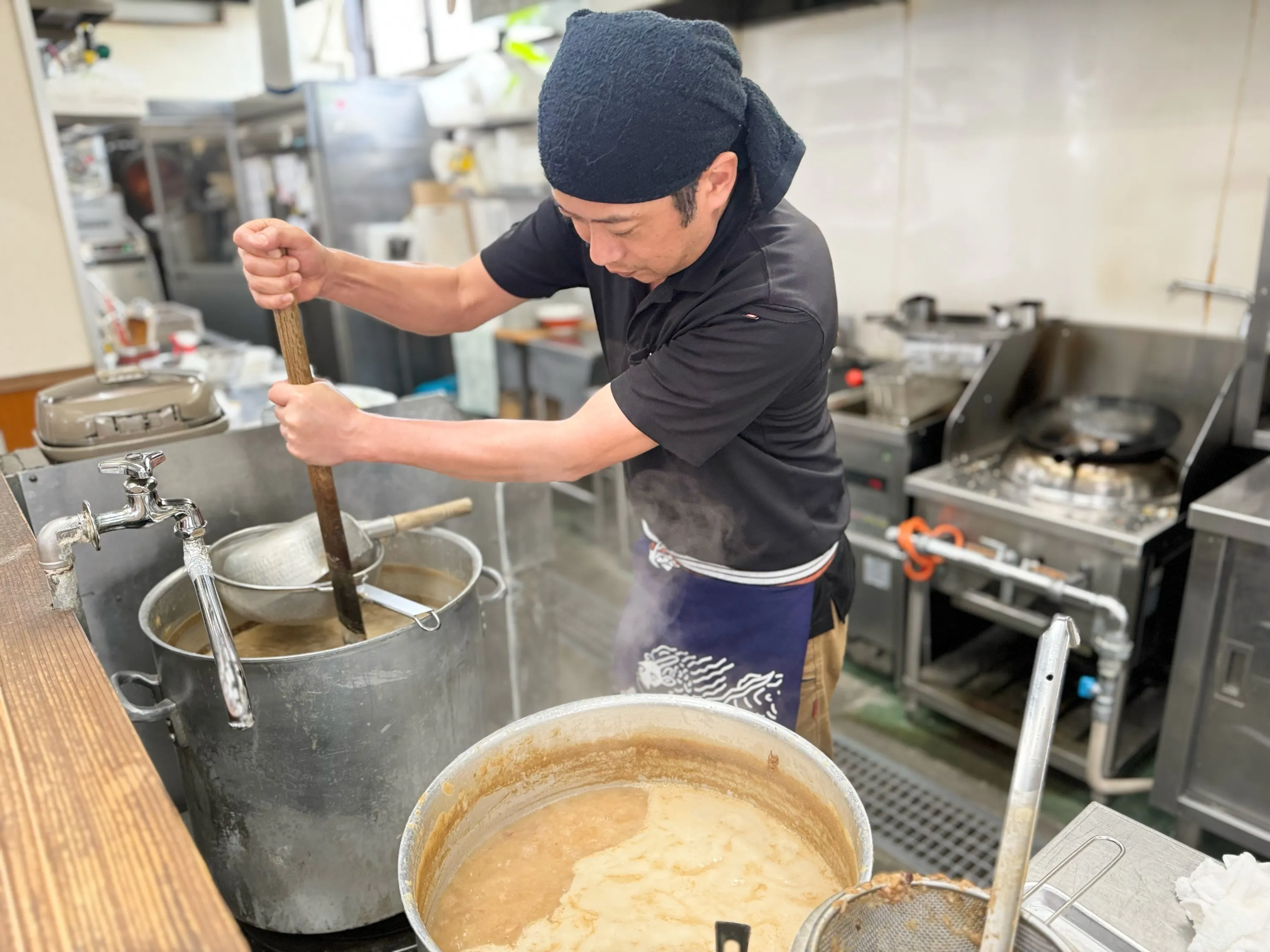 寸胴前で何十時間もスープを炊き続け、