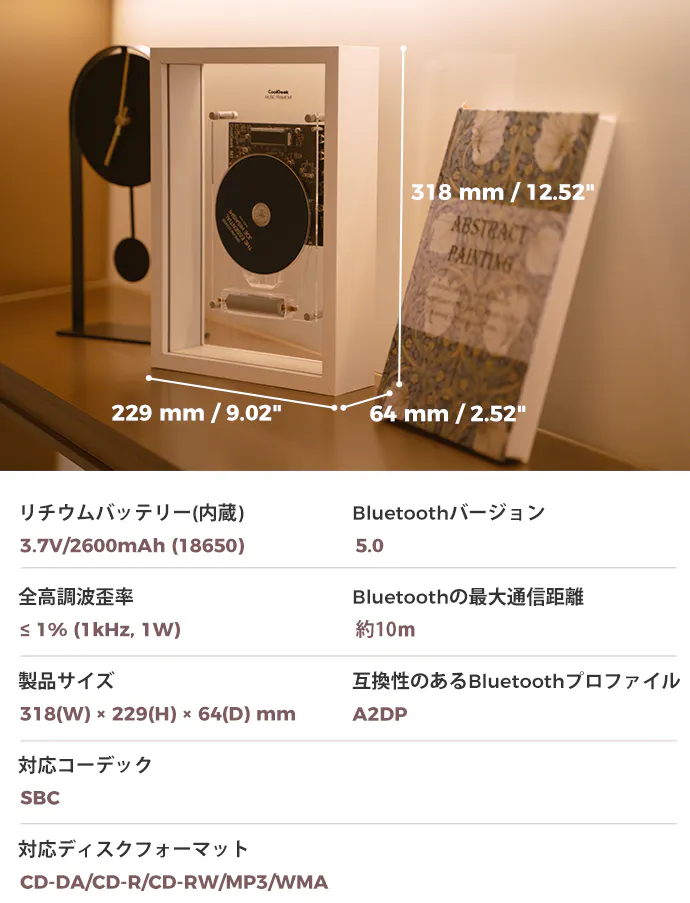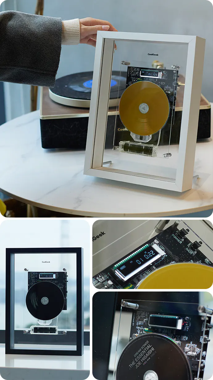 CDプレーヤー「CoolGeek M1」は、アートフレームの詩的なインスピレーションに啓発され、フレーム内に音楽をエレガントに埋め込んでおります。CDは流動的なアート作品に変え、メロディーがフレーム内で踊り、音符の間に時間が止まり、空間にアーティスティックな雰囲気を吹き込むようになります。