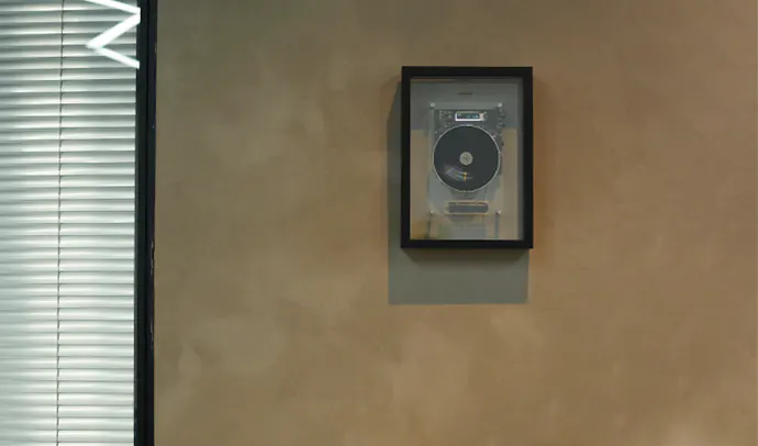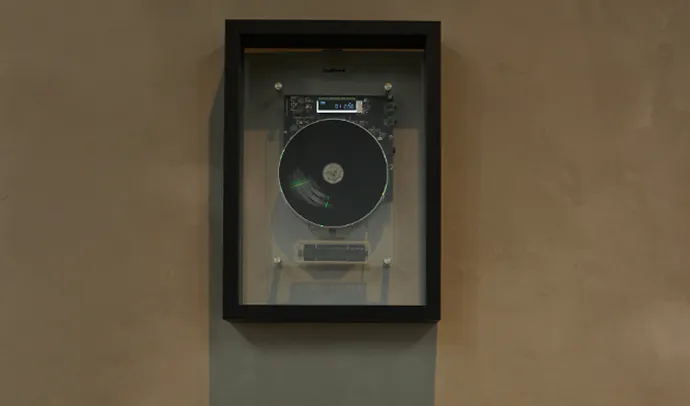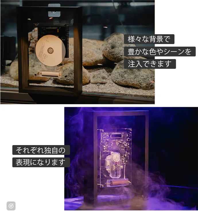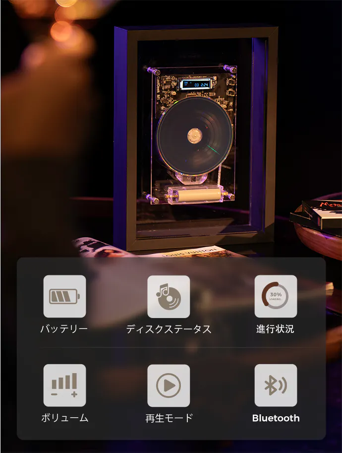 フレームにはデジタルディスプレイがシームレスに埋め込まれており、透明なアクリルを通して、光と影の中で踊るように再生情報が微妙に浮かび上がります。このデザインは音楽とアートを融合させ、詩的な美しさと実用的なエレガンスを調和することができます。