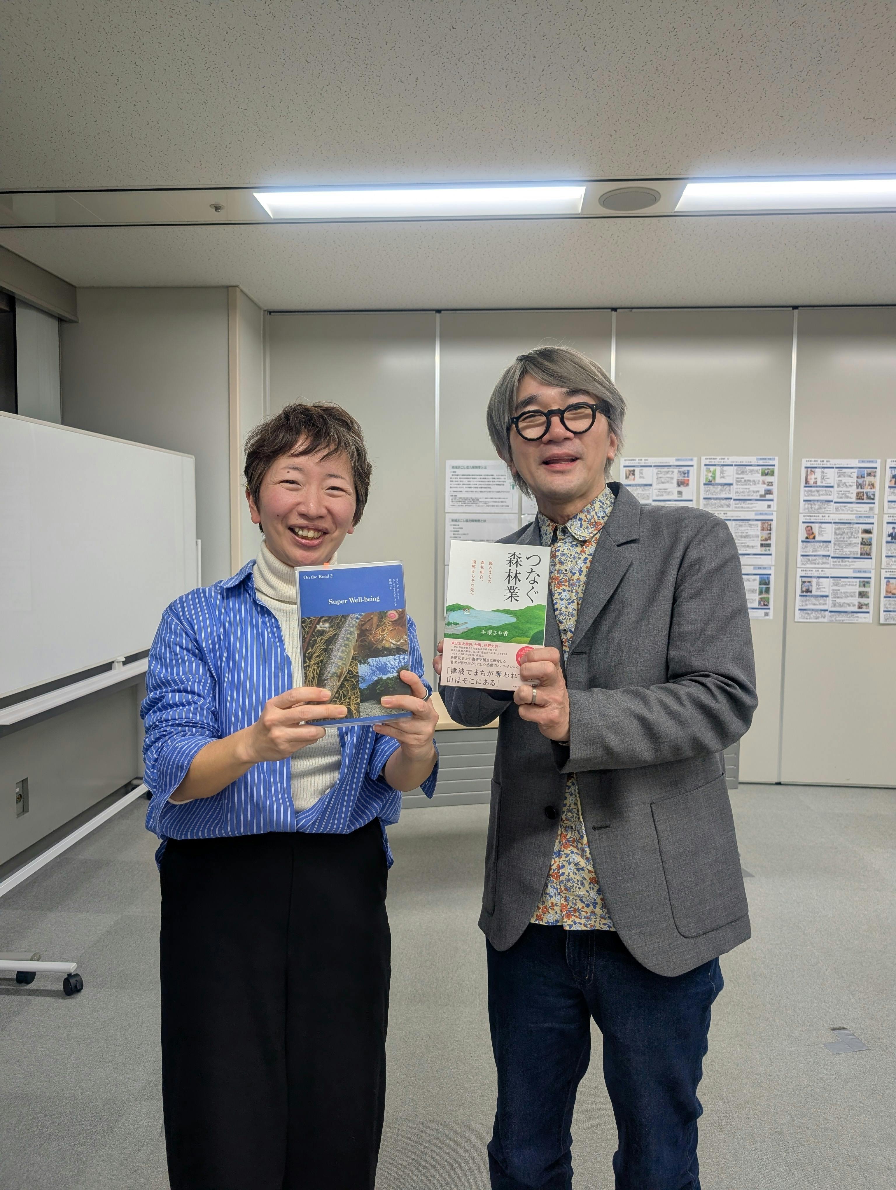 だいぶ前の2月下旬のことになりますが……、『つなぐ森林業』をビッグなおふたりにお渡しする機会にめぐまれました