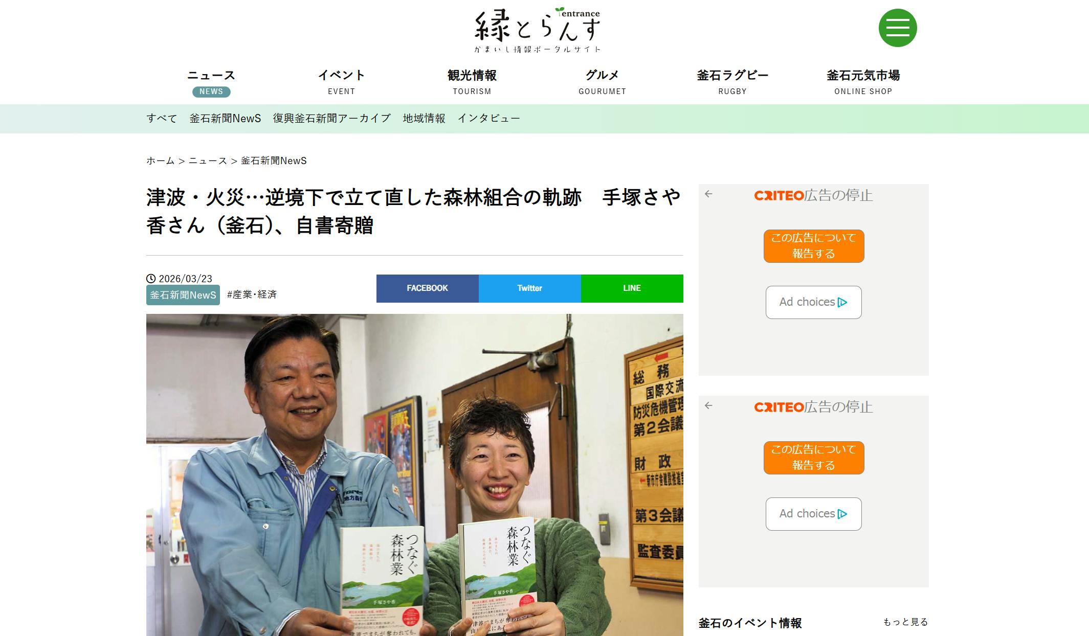震災後、地域のコミュニティペーパーとして発行されてきた復興釜石新聞のweb版である「縁とらんす」内の「釜石新聞News」で、『つなぐ森林業 海のまちの森林組合、復興からその先へ』を釜石市内の小中学校に寄贈した模様が紹介されました。