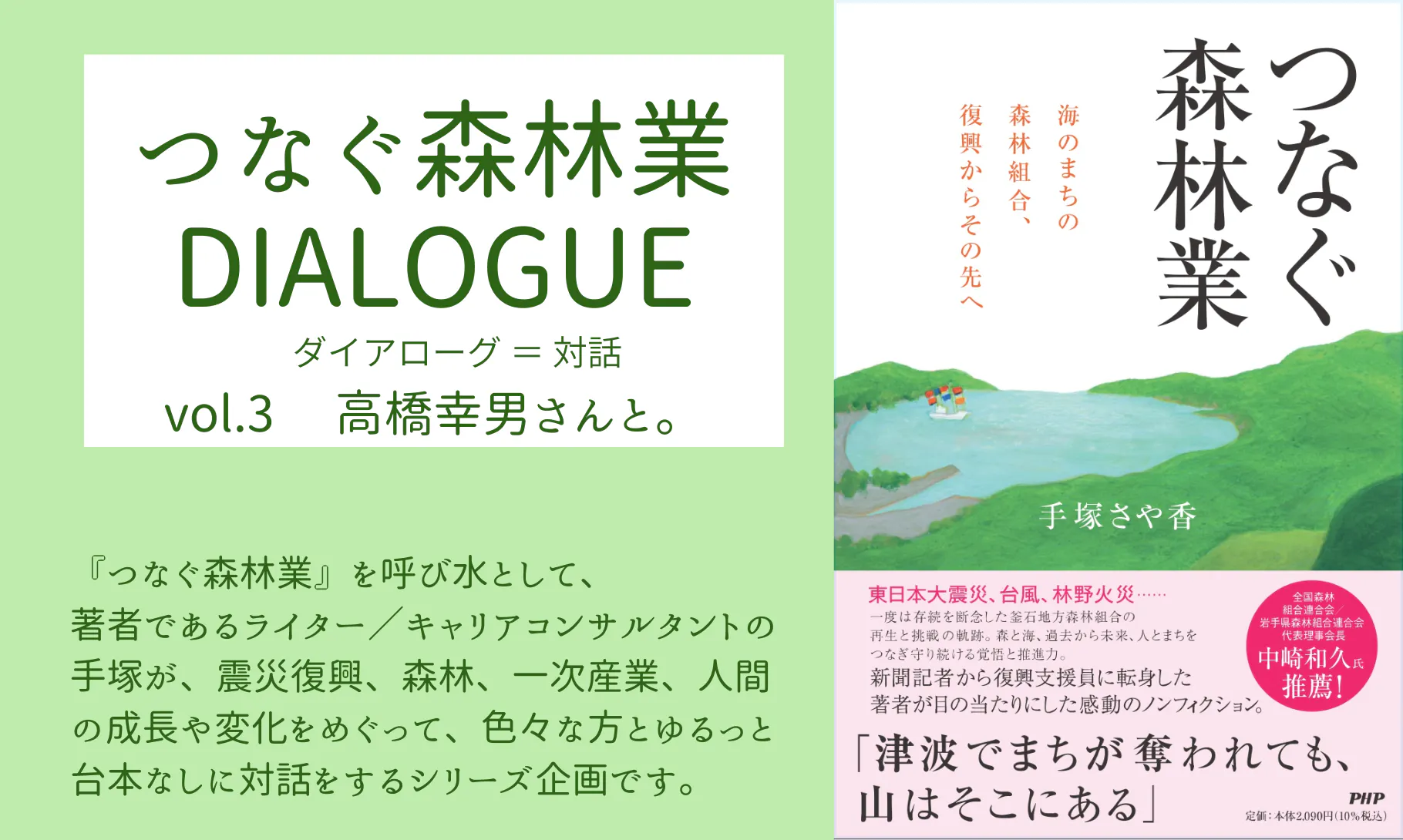この野田組合長の本の出版元が PHP研究所であり、出版のきっかけを作ったのが、釜石市出身で同社の編集者だった佐藤さんでした。この不思議なご縁をきっかけに、私の自著『つなぐ森林業』についても、佐藤さんに全面的にサポートいただきながら、PHP研究所から出版してもらう運びとなりました。