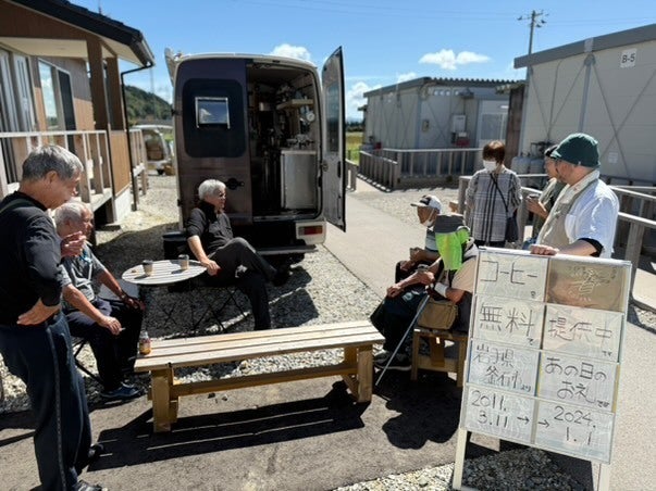 みんなに知らせないとってみんなで仮設住宅を廻って、岩手のコーヒーのにいちゃんきたがやー!って。
