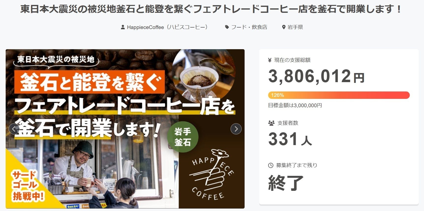 先日より開催しておりましたクラウドファンディング「東日本大震災の被災地釜石と能登を繋ぐフェアトレードコーヒー店を釜石で開業します!」につきまして、目標を達成したことをご報告させていただきます。