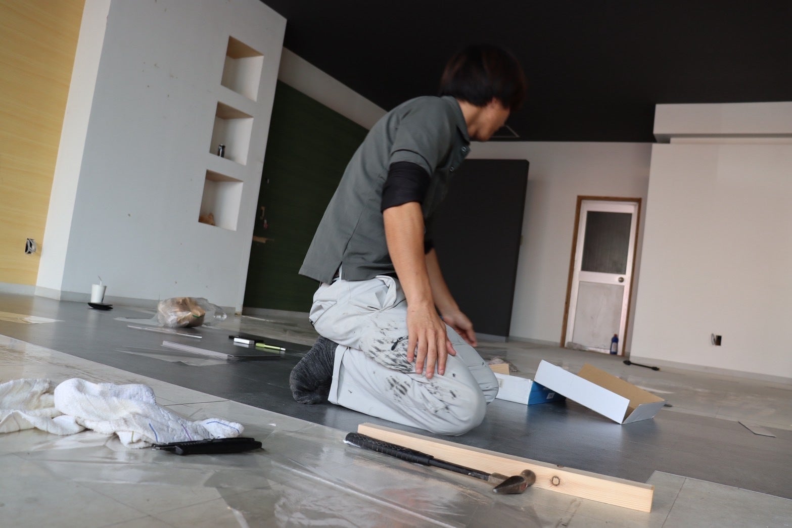 内装の床を張っている様子