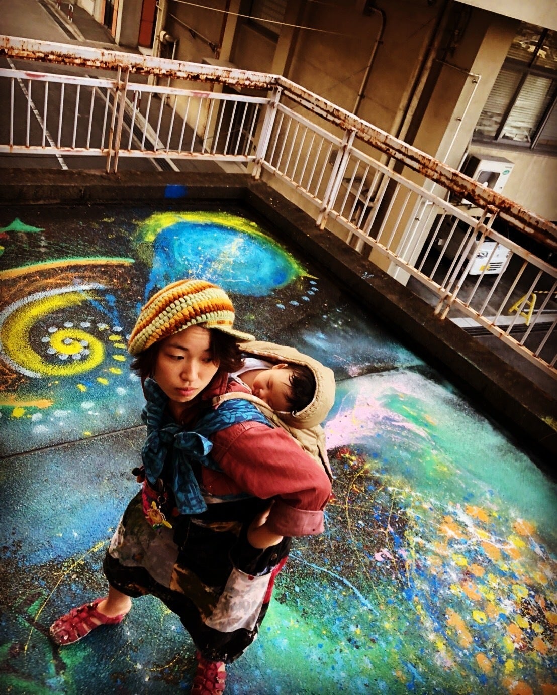 子どもを連れて壁画を描きながら、