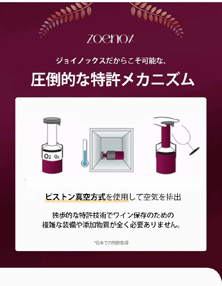 Zoenoxの特許取得済みメカニズムは、ピストン式真空法を採用し、確実に空気を除去します。複雑な機器や特別な技術を使わずに、ワインを長く最初の状態で保つことができます。