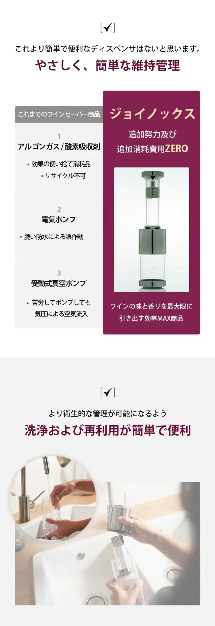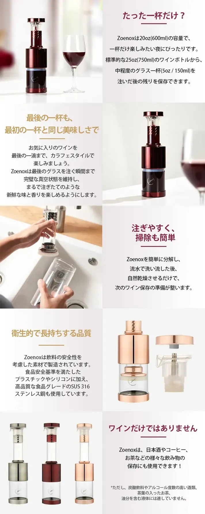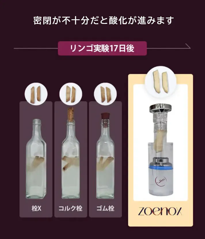 従来のワイン保存製品は、標準的な保管のために追加のメンテナンスが必要です。次のようなアイテムに馴染みがあるかもしれません。アルゴンガス / 酸素吸収剤 – 摂取のリスクあり。電動ポンプ – 故障しやすく、使いにくい。一般的な栓 / ストッパー – 使いづらく、密閉力が弱い。Zoenoxは、余計な手間やコストをかけずに、ワインの味と香りを存分に楽しめるようにします。さらに、Zoenoxはお手入れが簡単で繰り返し使用できるため、毎回快適にお楽しみいただけます。