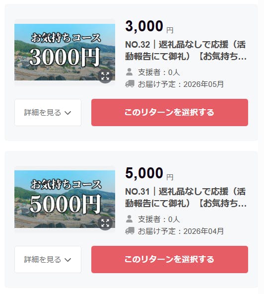 「返礼品無し 3,000円」のリターンが売り切れているので追加してほしい