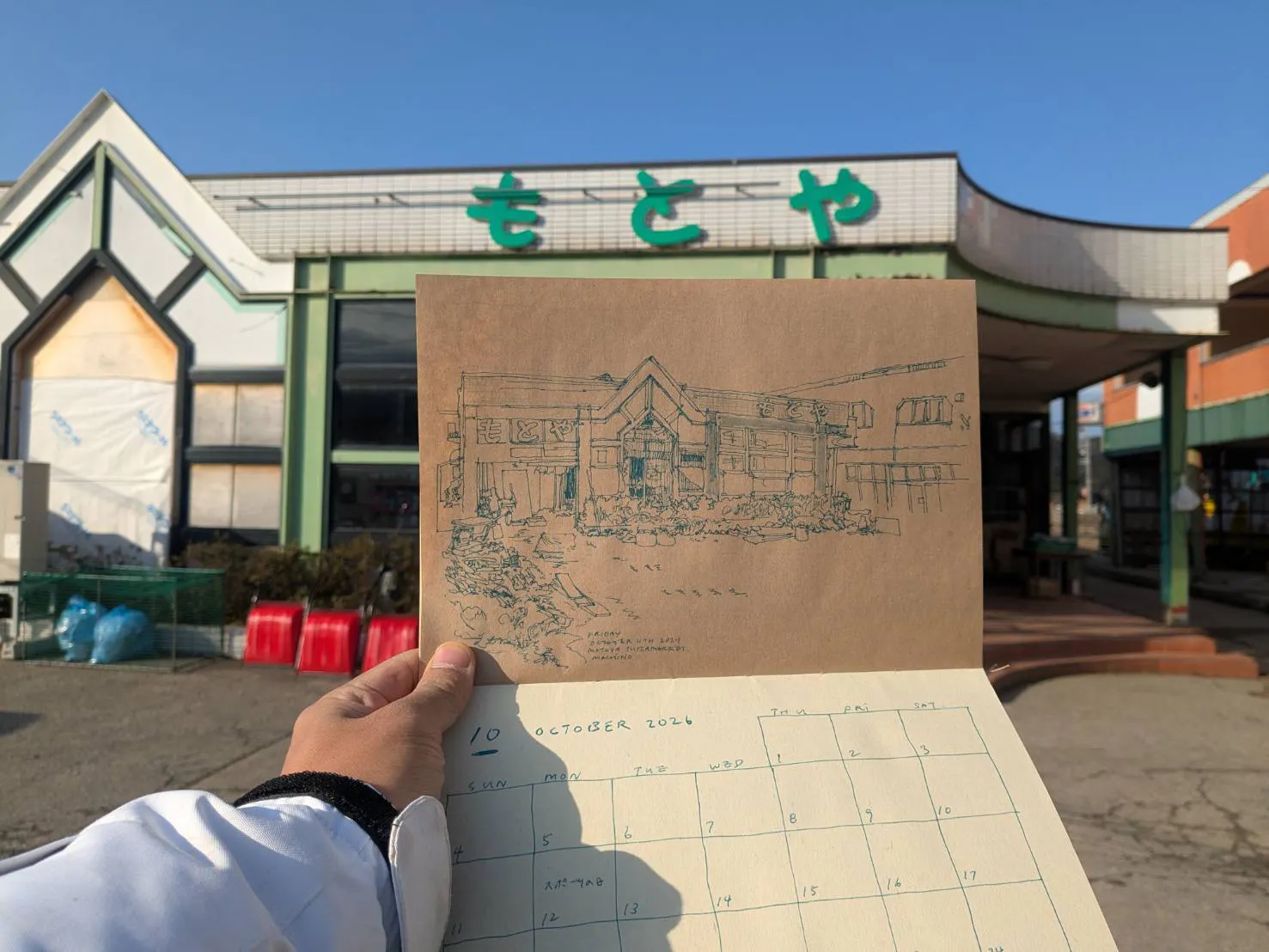 今回カレンダーのイラストに選ばれた12枚は、さらさらとすごいスピードで描かれたものです。例えば下のもとやスーパーの全景は半日で。