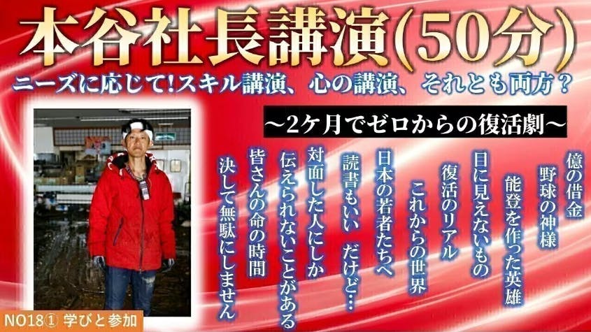 こちらでは被災時の体験や心情の話は抑えめにして、被災した時に大事になること、会社としての構え、従業員の動き方、経営をどうやって維持するかといった具体的な話をする予定です。