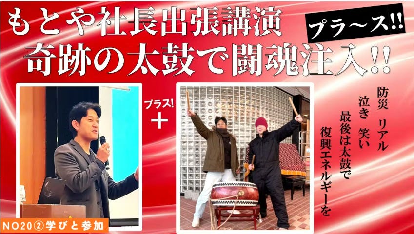 NO.20|もとや社長 講演(太鼓パフォーマンス付)+防災トーク(¥200,000)