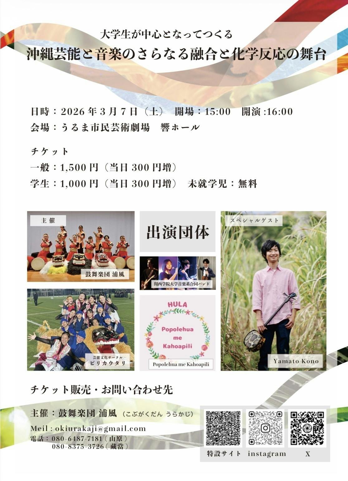 また今回の公演では、私たち鼓舞楽団 浦風が中心となり、学外の音楽団体や県内外で活躍するアーティストを迎え、芸能と音楽が交わる新たな表現に挑戦します。