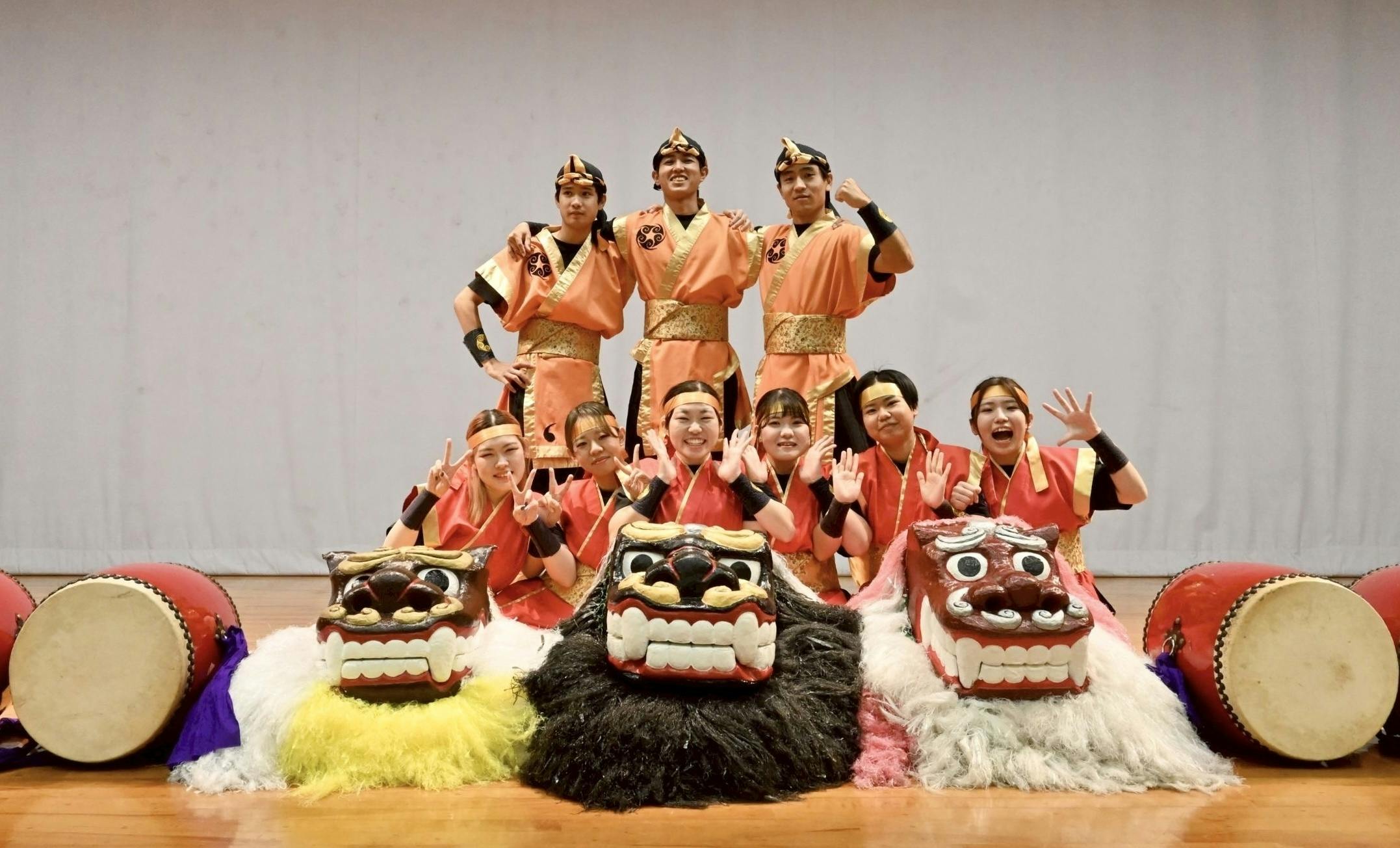 私たちは、創作エイサーと獅子舞を軸とし、沖縄に伝わる芸能に新たなスタイルを取り入れながら舞台づくりを行っています。伝統芸能の継承に貢献したいという想いから、沖縄国際大学のサークルとして2002年に結成し、今年度で23年目を迎えました。