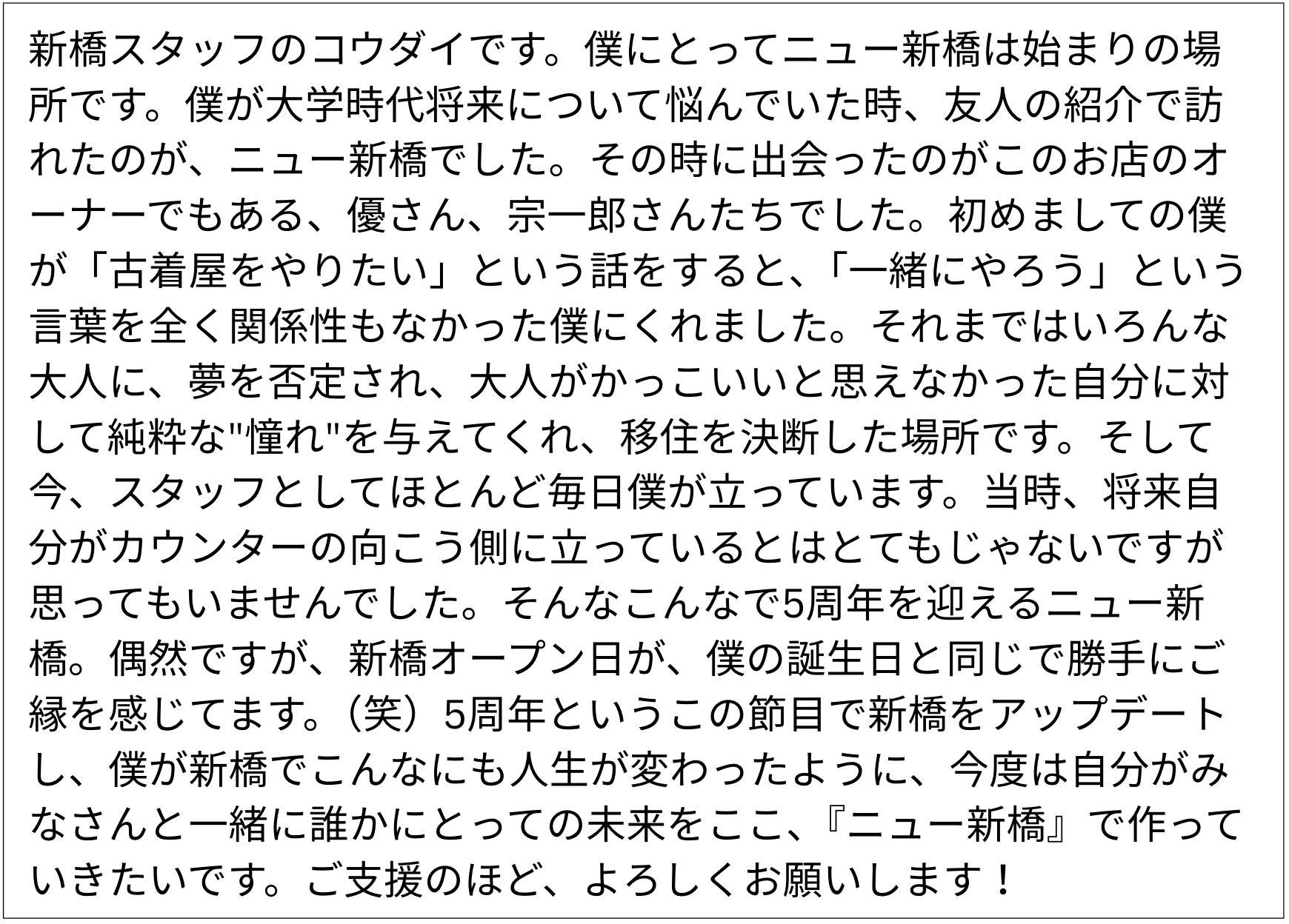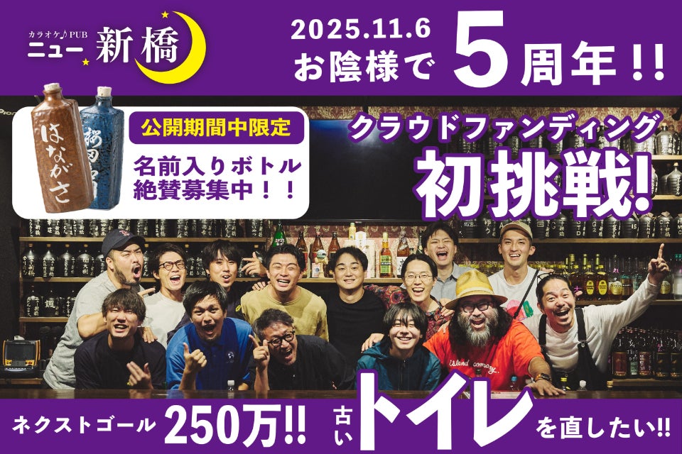 『カラオケパブ ニュー新橋』が2025年11月6日で早いもので5周年を迎えます。当初は、「自分たちのまちに、二軒目の飲み屋が欲しい」という想いでつくりました。コロナ禍の2020年から5年をかけて、色々な方に支えられ、自分たちだけではなくいつしか色々な方にとっての居場所になりつつあると感じています。