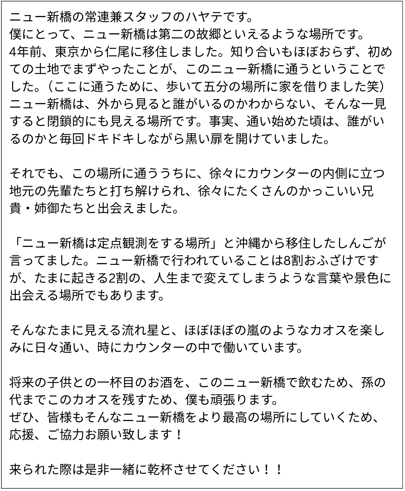 かっちゃんの思い出も風景も俺らが守るから。またニュー新橋でのご来店お待ちしております。