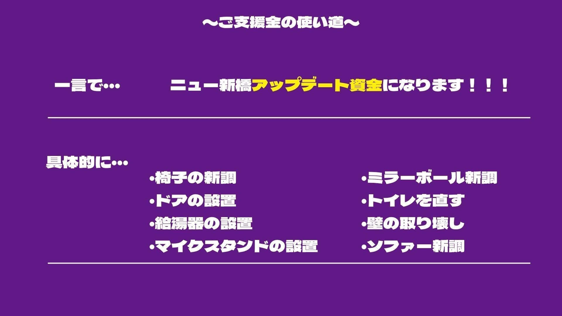 宗)URASHIMA VILLAGEが共同出資で建てられたちょうど後のタイミング。自分らの飲める場所を作ろうという思いから、コロナ給付金を元手に仲間数人で共同出資をしあい、それからリアルクラウドファンディングの形で総勢250名の方からもお金を集めてニュー新橋を立ち上げました。その時に支援していただいた方の名前を入れたボトルはニュー新橋のシンボルの1つです。もともとは自分たちがカラオケで歌いながら飲めるというハード面の価値だけだったのかもしれません。それがいつしか、誰かにとってのかけがえのない出会いが生まれる居場所となり、ソフト面での価値を感じてくれる人が増えてきたと感じています。