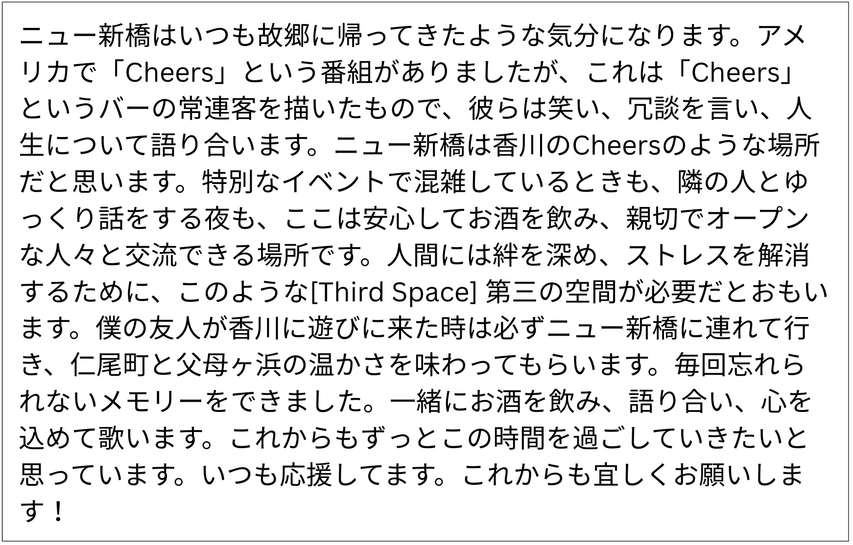 優)ニュー新橋は、自分たちの2軒目の飲みの場として欲しいと思って作った場所でした。最初は、自分たちが飲みの場所として使ったり、歌ったりして、ただただ自分たちが楽しく使うための場所でした。しかしいつしか、地元の方、移住者の方、視察で仁尾にたまたま訪れた方など様々な方に使っていただけるようになり、ある意味で意図していなかった「自分たちの場所を超えた誰かの居場所」になりました。おこがましいですが嬉しいことに、他の誰かにとっても残ってほしい場所になってきたとも感じています。そんな誰かにとっての居場所が、なにより僕も続いてほしいなと思っています。
