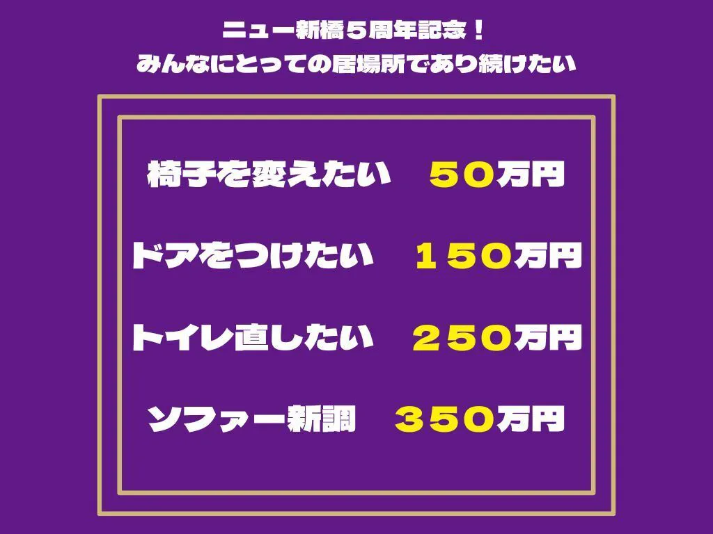 『カラオケパブ ニュー新橋』が2025年11月6日で早いもので5周年を迎えます。当初は、「自分たちのまちに、二軒目の飲み屋が欲しい」という想いでつくりました。コロナ禍の2020年から5年をかけて、色々な方に支えられ、自分たちだけではなくいつしか色々な方にとっての居場所になりつつあると感じています。