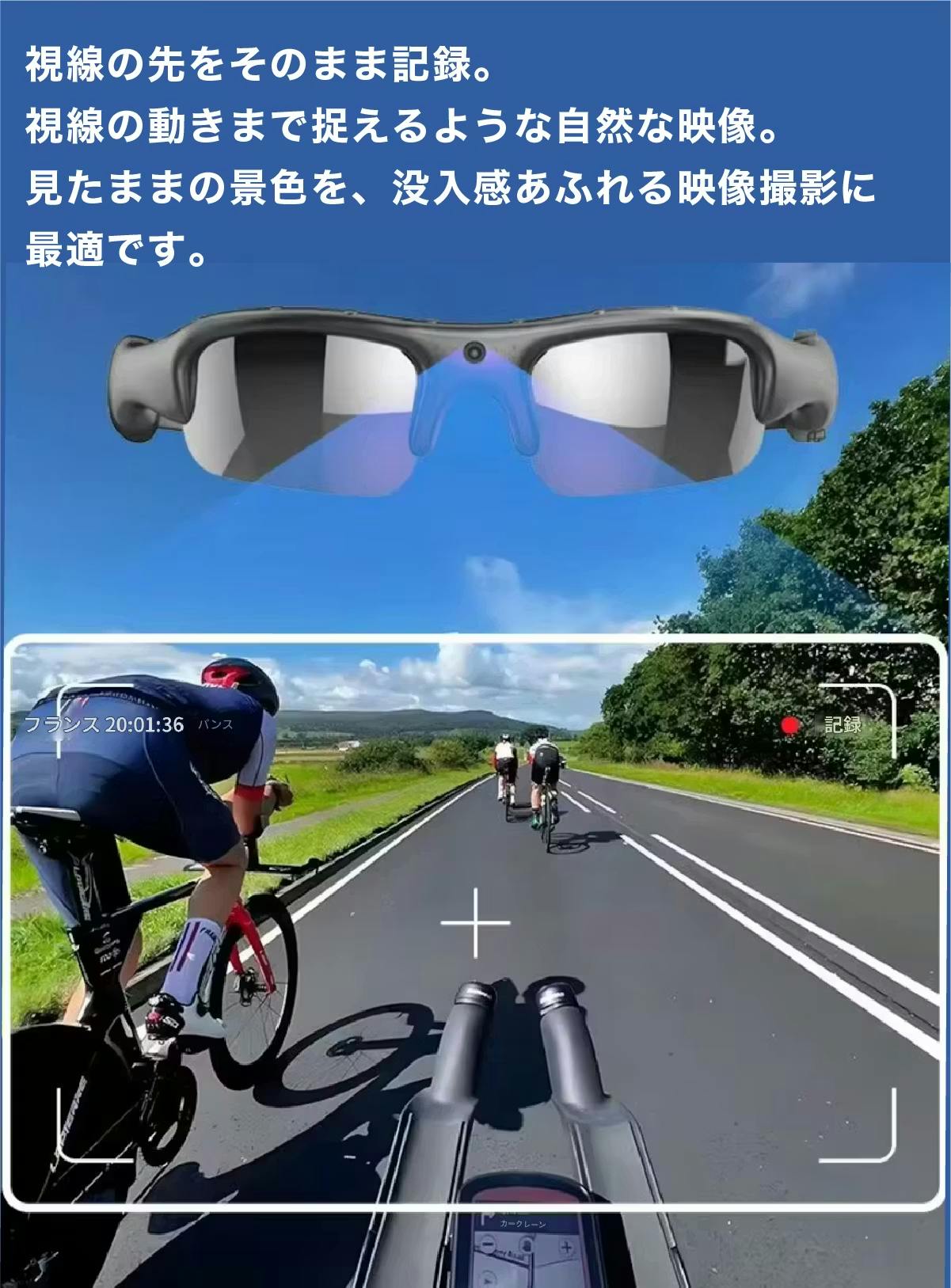見た目はごく普通のスポーティなサングラスに見えるスマートカメラグラスですが、実はフレーム中央に小型カメラを搭載しています。このカメラが、あなたの目線と同じ視点で景色をそのまま録画・撮影してくれるため、旅行やアウトドア、日常の何気ない瞬間も自然に記録可能です。手に持つ必要がないので、行動を妨げずに撮影できるのが大きな特徴です。