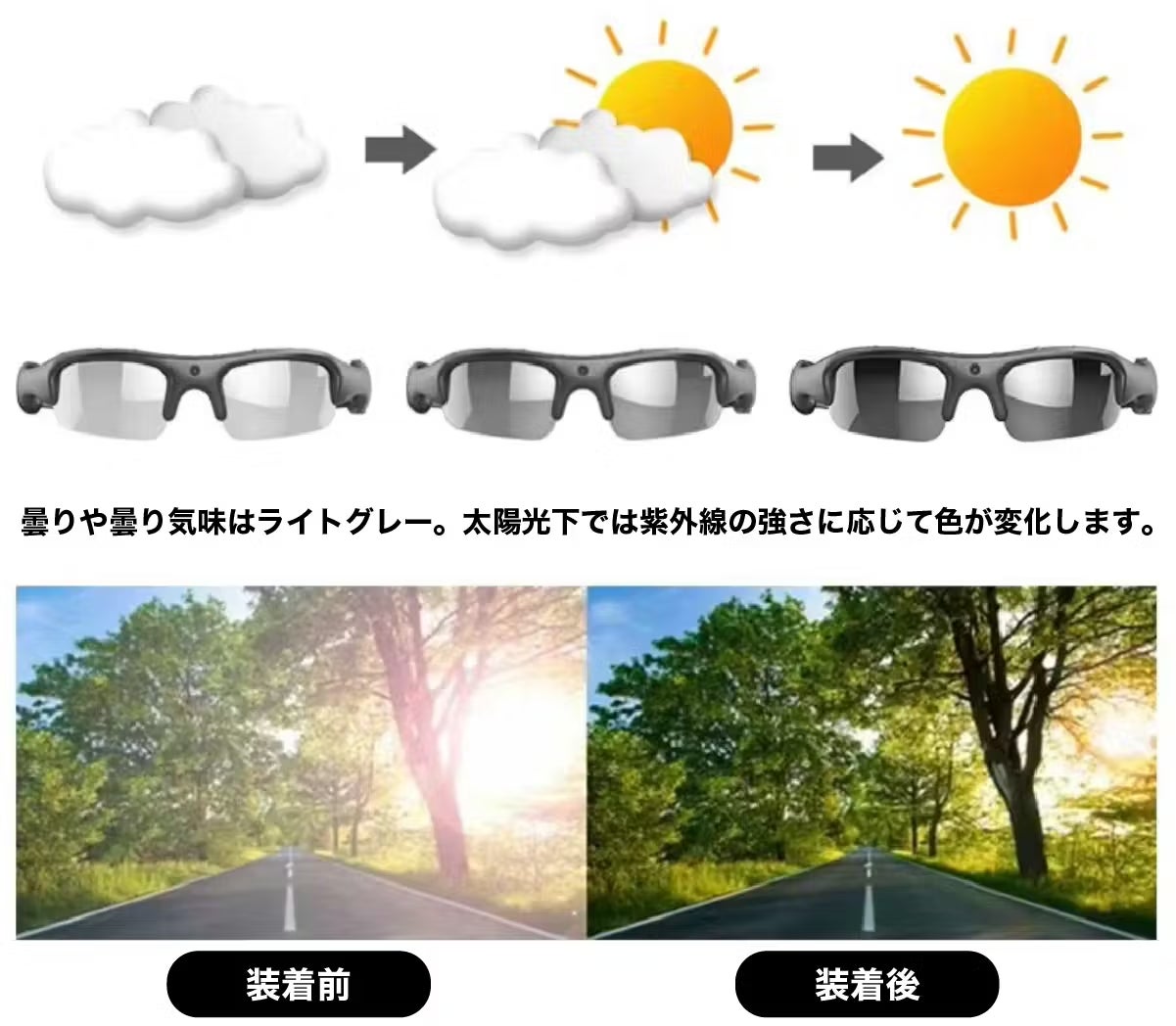 このスマートカメラグラスの特徴は、紫外線の強さに合わせてレンズが自動で色調を変える機能です。曇りや薄曇りの時はライトグレーで視界をクリアに保ち、日差しが強くなるとレンズが濃くなって眩しさを抑えます。これにより、日中の屋外でも目に優しい見え方を実現し、長時間の使用でも快適に過ごせるのが魅力です。季節や時間帯を問わず、常に最適な視界を確保できる点も大きなメリットです。