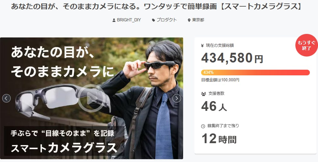 2026/01/18 12:00ご支援者様、あなたの目が、そのままカメラになる。ワンタッチで簡単録画【スマートカメラグラス】にご興味をお持ちいただきありがとうございます。お陰様で、開始から支援総額43万円達成することができました!終了までわずか 12時間 となります。<手がふさがらないので、安全で快適に撮影が可能です。目線と同じ位置にカメラを搭載し、臨場感あふれる“一人称視点動画”を簡単に記録できます。サングラスとしても普段使いでき、必要な時にワンタッチで録画をスタート。日常の瞬間を自然に捉え、記録する新しい体験を提供します。>プロジェクト終了後、「あなたの目が、そのままカメラになる。ワンタッチで簡単録画【スマートカメラグラス】】」をCampfire特別価格で入手することはできなくなりますので、ご支援がまだの方、追加支援をご検討の方はお急ぎくださいますようお願い申し上げます。ご興味のある方、ぜひ支援お願い致します。https://camp-fire.jp/projects/888674/viewBrightチームは、当プロジェクトをもっと多くの方に知っていただきたいと考えております。よかったら、FacebookやTwitter等のSNSでのシェア・拡散をお願い致します。#スマートカメラグラス #brightdiyどうぞよろしくお願い致します。Brightチーム もっと見る