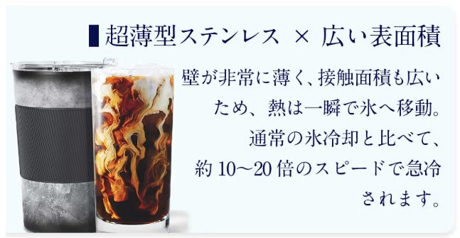 Ice Quick Cup の最大の特長は、超薄型ステンレスと広い表面積を採用している点にあります。カップの壁が非常に薄く作られているため、熱が効率よく伝わり、飲み物の熱を瞬時に吸収します。さらに接触面積が広いため、熱移動が一気に進み、従来の冷却方法と比べて約10〜20倍というスピードで急冷が可能になります。熱い飲み物も短時間で飲み頃の冷たさへと変わります。この構造が、スピーディーで安定した冷却を実現しています。