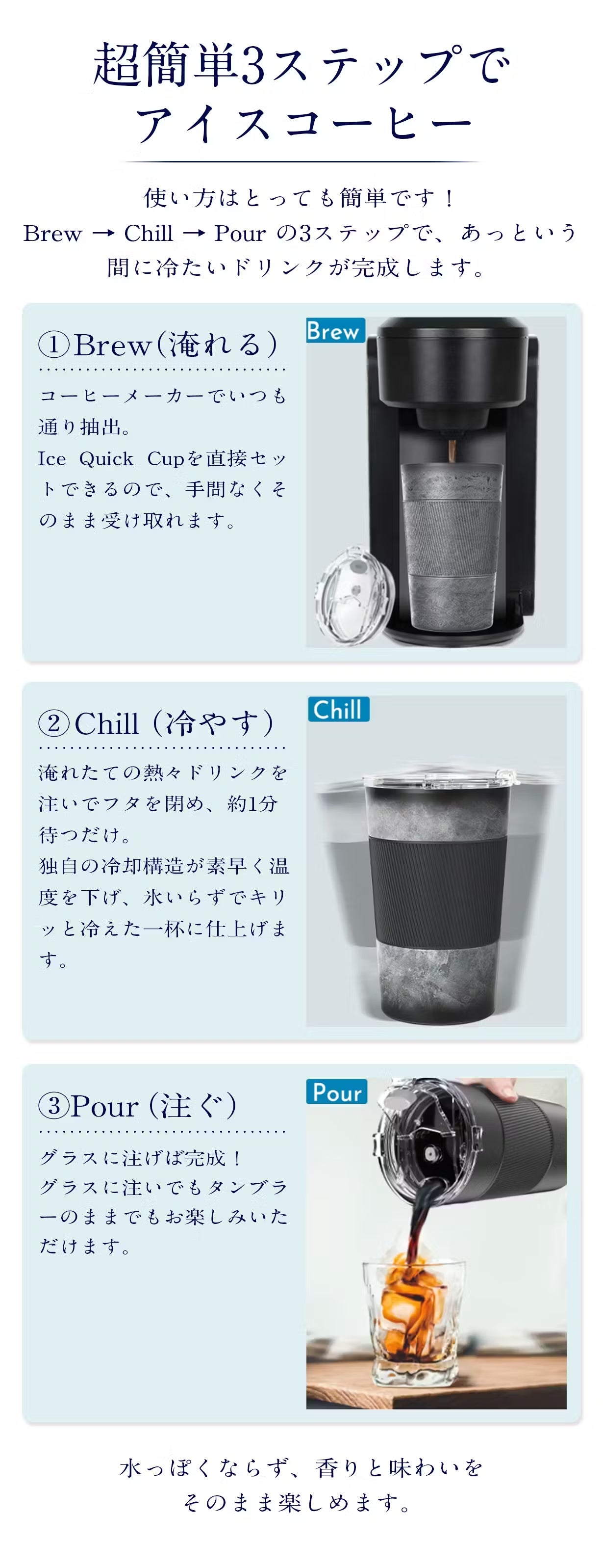Ice Quick Cupは、「氷が溶けない冷却構造」と「超簡単な3ステップ」を両立した、これまでにないカップです。手間をかけずに、香り高くコクのある冷たい一杯を楽しめることで、日常のドリンク体験が大きく変わります。味を大切にしながら、手軽さも求めたい方に、ぜひ一度試してほしいアイテムです。