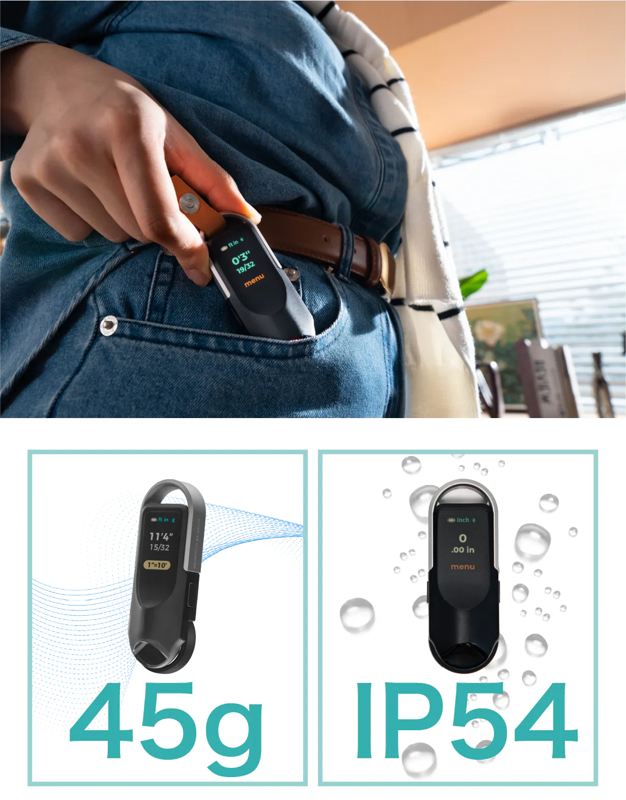 NeoRuler GO は約45gの軽さと12mmの薄さで、ポケットにもすっきり収まります。