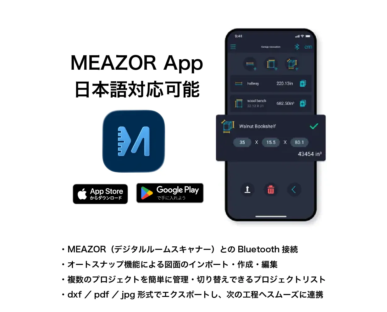 A. MEAZOR APP では、PDF・JPG・DXF・3D DXF 形式でのエクスポートが可能です。