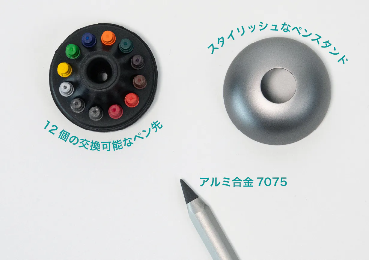 携帯用ケースとデスク用スタンドを組み合わせ、アルミ合金製の本体に12色の替え芯と消しゴム機能を搭載しています。