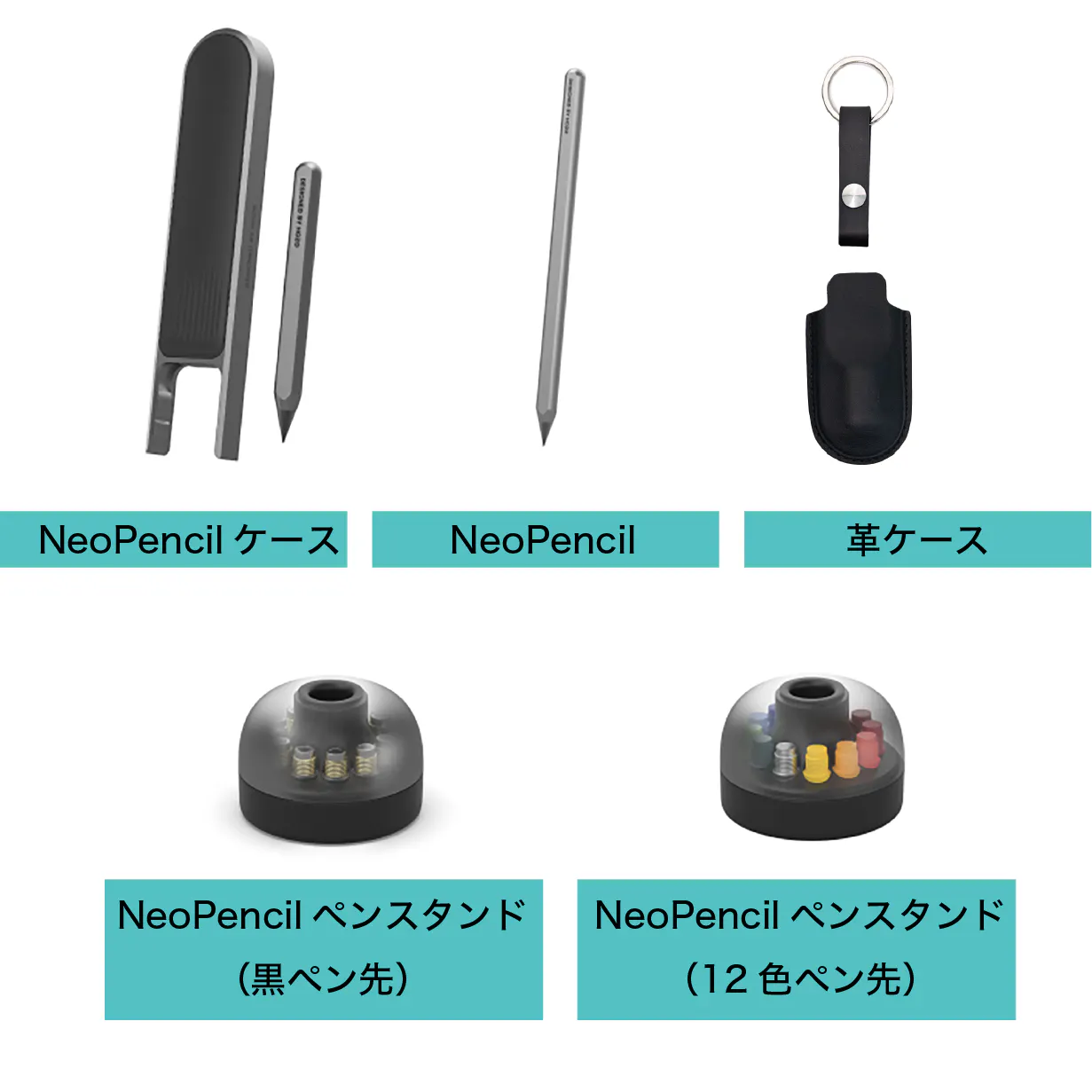 レザーケース、NeoPencil Case、NeoPencil ミニペン、充電ケーブル、NeoPencilペンスタンド(12色のペン先内臓)