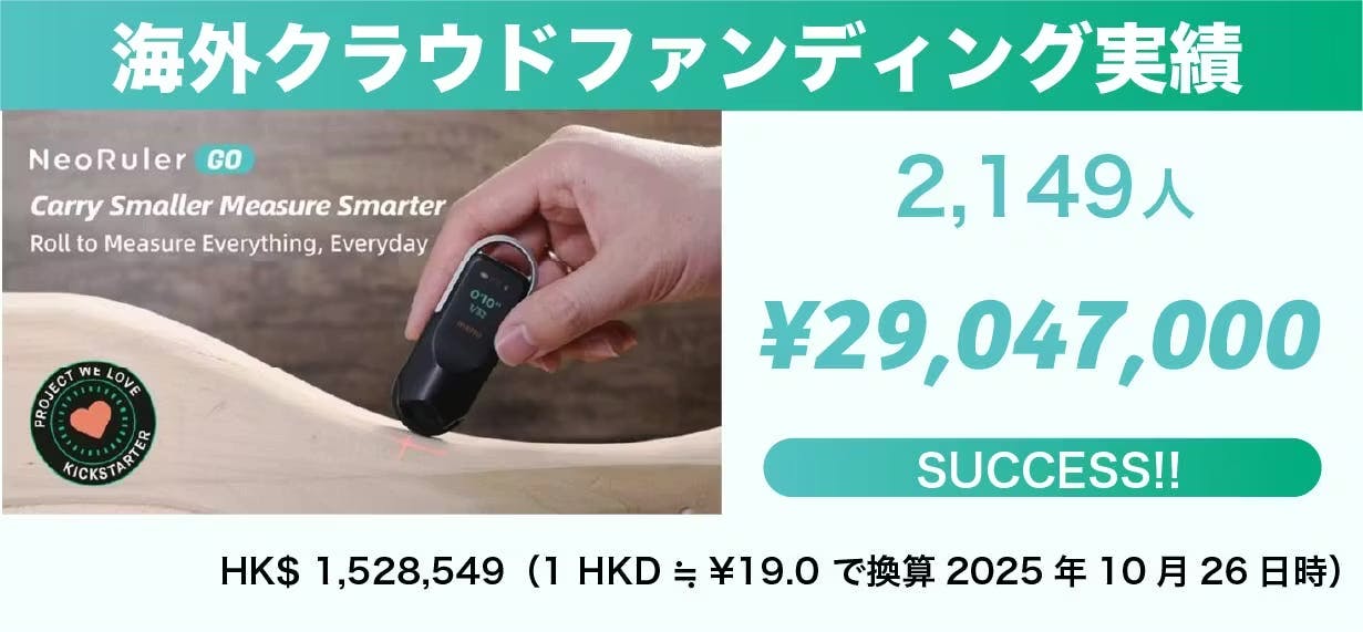 日常生活では家具選びや洋服づくり、DIY、クラフト制作など「少し測りたい」場面が多い一方、従来のメジャーでは曲面や柔らかい素材、不規則な形状を正確に測るのは困難です。そうした不便を解消するために生まれたのが、手のひらサイズで“転がすだけ”で測定できるデジタルメジャーNeoRuler GO。公開直後からクラウドファンディングで注目を集め、2,100人以上から約2,900万円を獲得したこの製品は、コンパクトながら高精度な測定を実現し、「測る」をより自由でスマートな行為へと進化させました。
