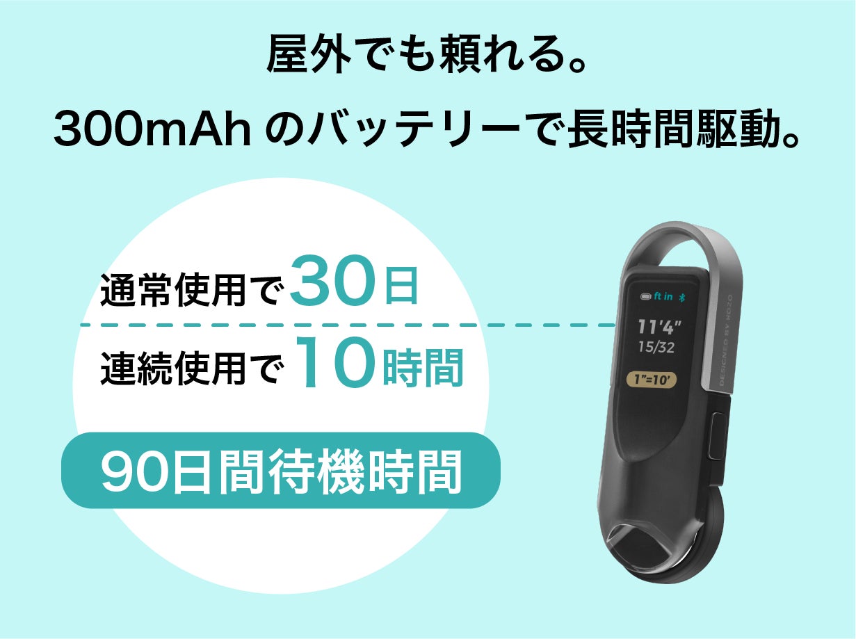A. バッテリー容量は 300mAh。待機状態で最大 90日、通常使用で約30日、連続使用では約10時間ご利用いただけます。