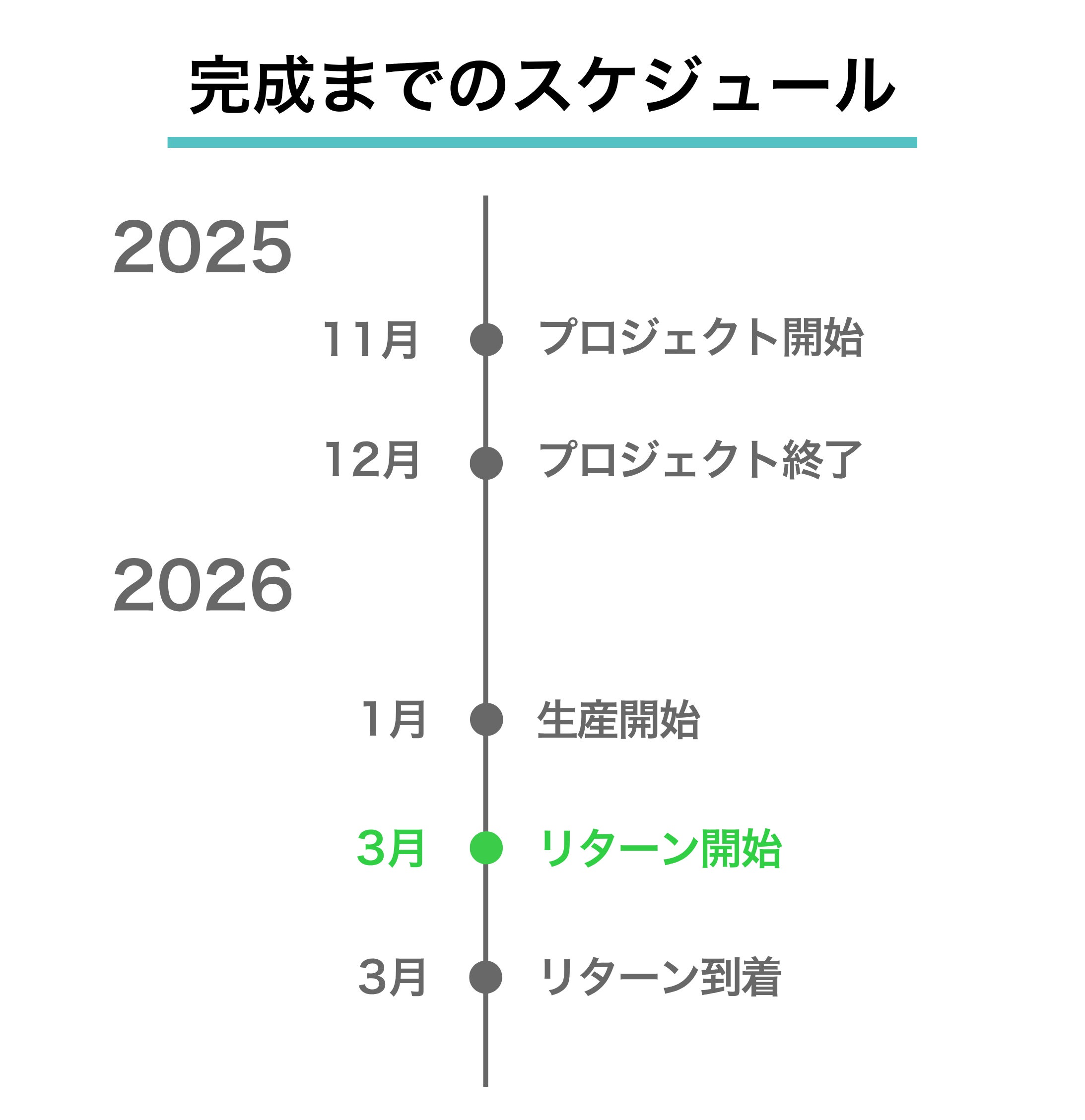 ※本文中に記載させていただいたスケジュールは、あくまでプロジェクト公開時点の予定です。 クラウドファンディングを経て輸入を行う性質上、配送遅延のおそれがございます。