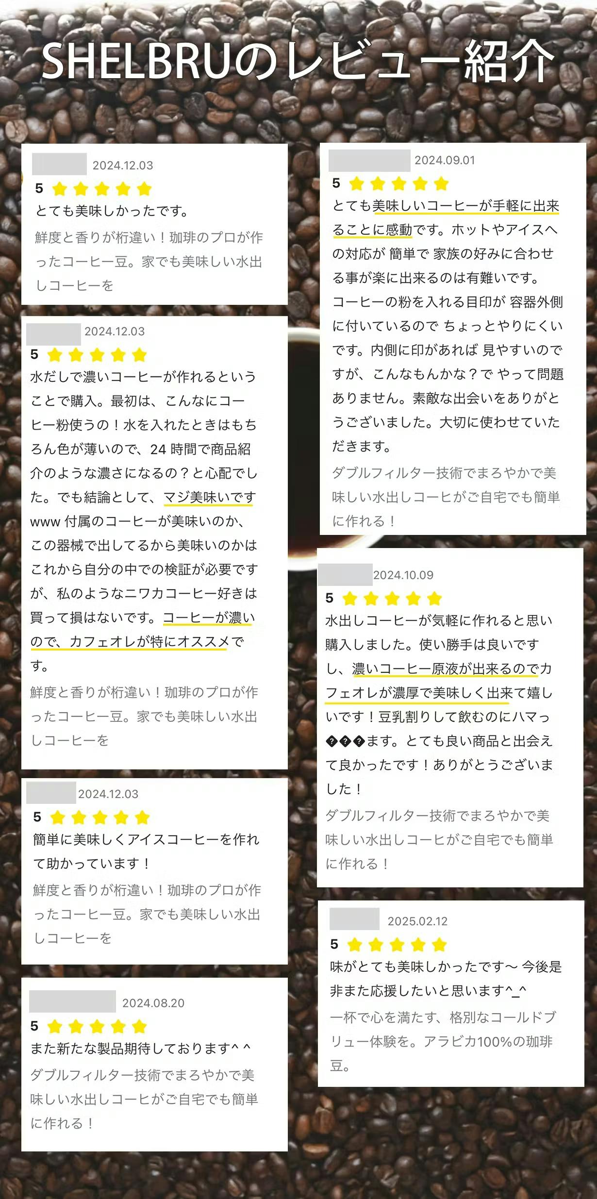 SHELBRUのCOLDBREW SYSTEM PROは簡単に美味しいコーヒーが作れる優れもの。皆様のコーヒーとの生活がより楽しくなるよう、私たちは製品を絶えず企画し、開発しています。より多様なコーヒー抽出ツール、グラインダーなど様々な製品をこれからも製作する予定です。