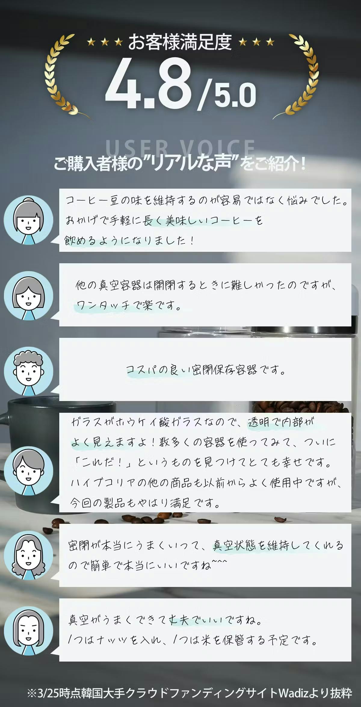 真空を作るのはたった15秒。どなたでも簡単に操作することができ、ストレスフリーの使用感!