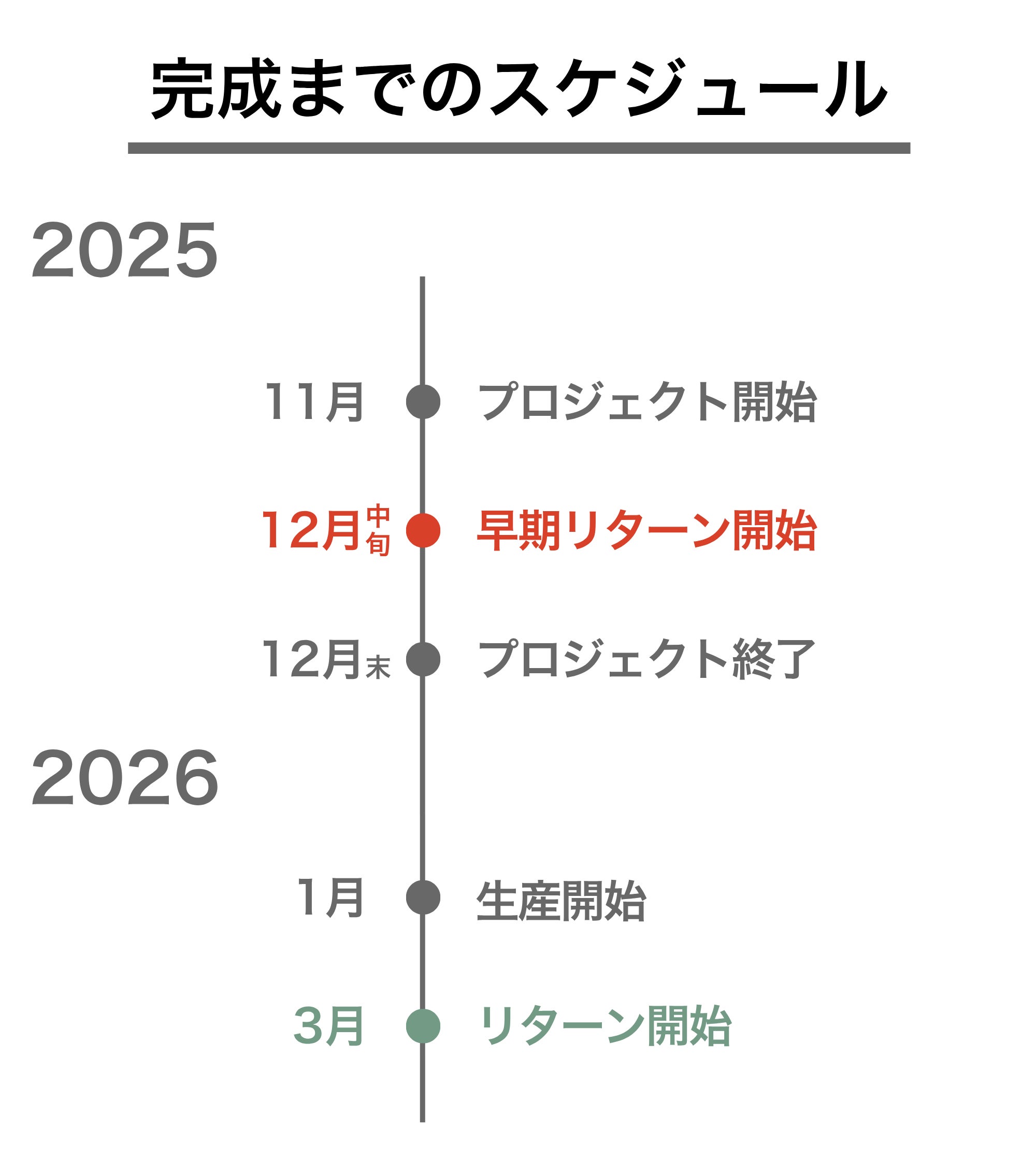 ※本文中に記載させていただいたスケジュールは、あくまでプロジェクト公開時点の予定です。支援の性質上、配送遅延のおそれがございます。