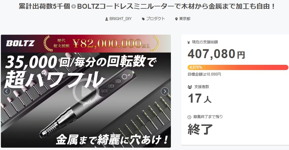 皆様にご満足いただけるリターンをお届けできるよう、全力で取り組んで参りますので引き続き、「累計出荷数5千個◎BOLTZコードレスミニルーターで木材から金属まで加工も自由!」をよろしくお願い致します。