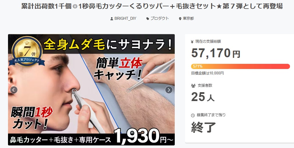 皆様にご満足いただけるリターンをお届けできるよう、全力で取り組んで参りますので引き続き、「累計出荷数1千個◎1秒鼻毛カッターくるりッパー+毛抜きセット★第7弾として再登場」をよろしくお願い致します。