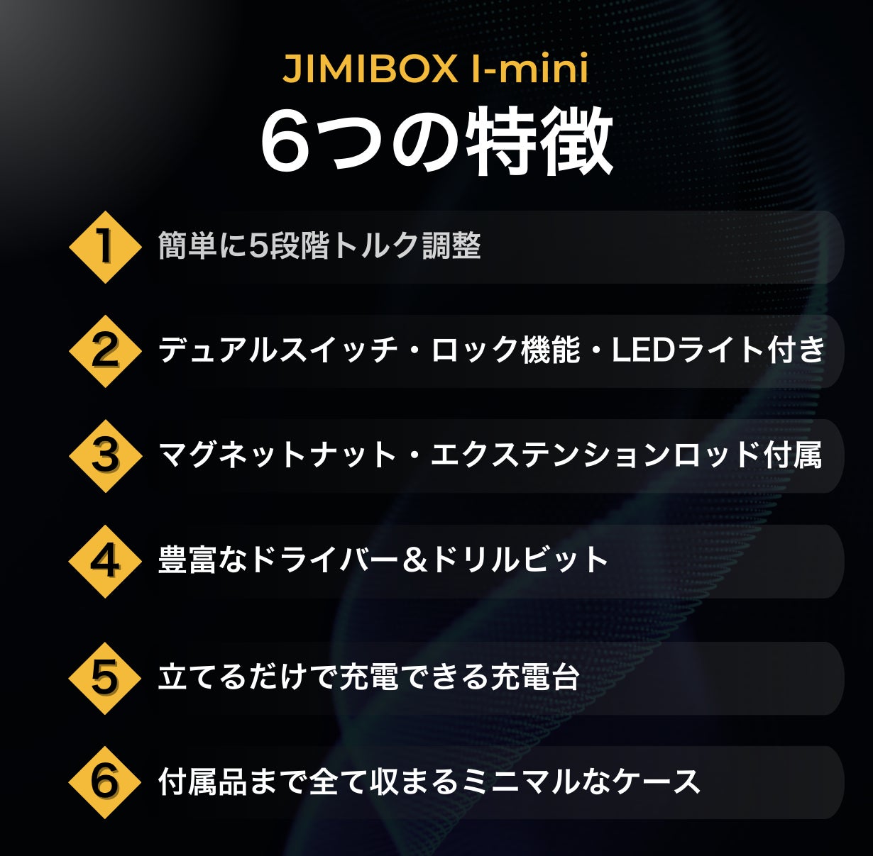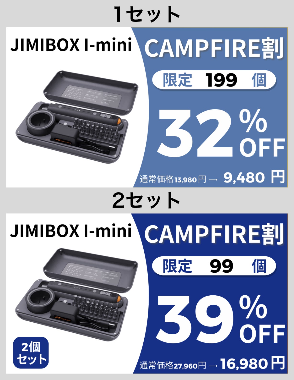 JIMIBOX I-mini はたくさん支援いただいたJIMIBOX X1-I からツールを厳選して持ち運びやすくコンパクトにまとめた多機能セット。トルク調整機能やロック機能などの便利機能が詰まった多機能電動ドライバーと、立てたまま充電できる充電台、様々なビットと便利ツールを全てまとめてコンパクトに保管、持ち運びできるセットで、皆様にもっと自由にDIYを楽んでほしいという思いでプロジェクトを起案させていただきました。