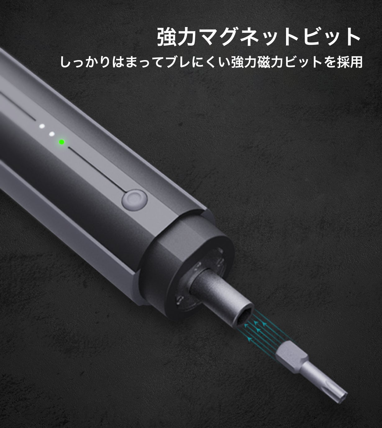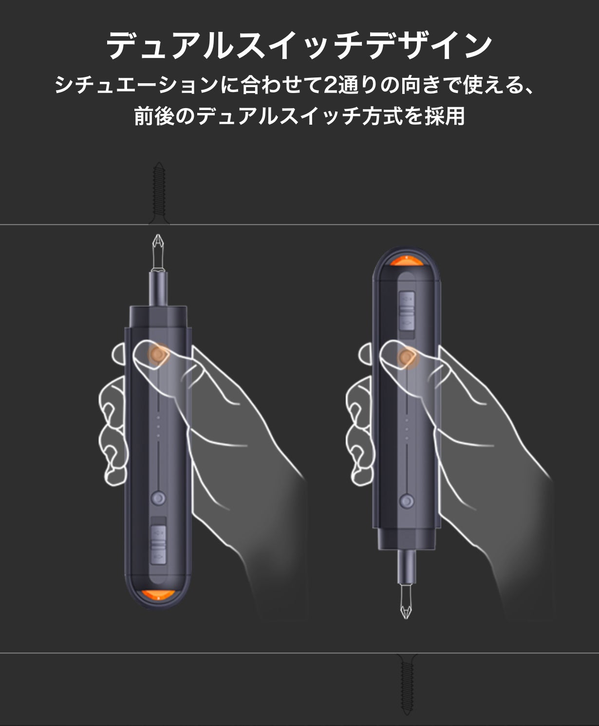 ロック機能と併用すれば、スイッチを押すだけでLEDライト付きの手動ドライバーとして使えます!