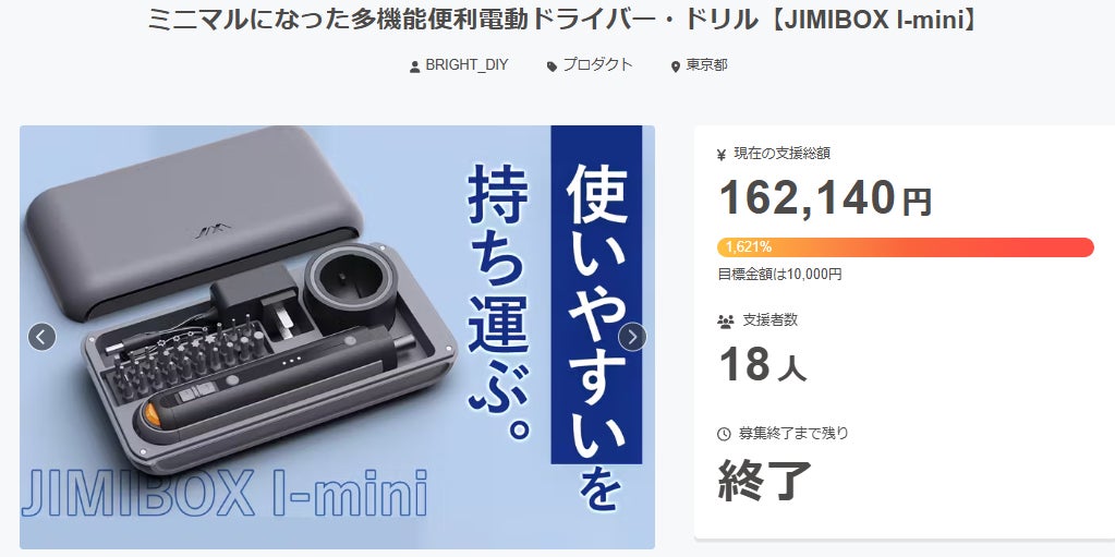 2026/04/01 20:45サポーター様、ミニマルになった多機能便利電動ドライバー・ドリル【JIMIBOX I-mini】にご興味をお持ちいただきありがとうございます。プロジェクト開始から47日目で18人ものご支援者の方々より支援頂き、無事プロジェクト終了を迎えることが出来ました。早速皆様のリターンを2026年06月末にお届けできるよう準備を始めております!皆様にご満足いただけるリターンをお届けできるよう、全力で取り組んで参りますので引き続き、「ミニマルになった多機能便利電動ドライバー・ドリル【JIMIBOX I-mini】」をよろしくお願い致します。BRIGHTチーム もっと見る