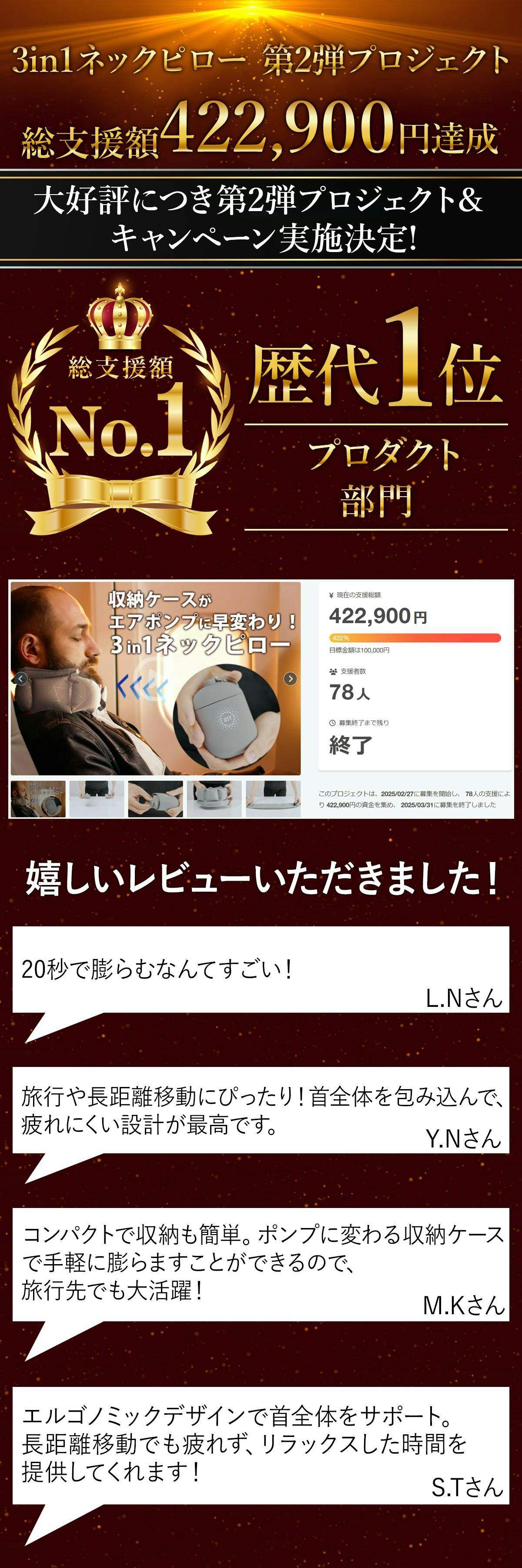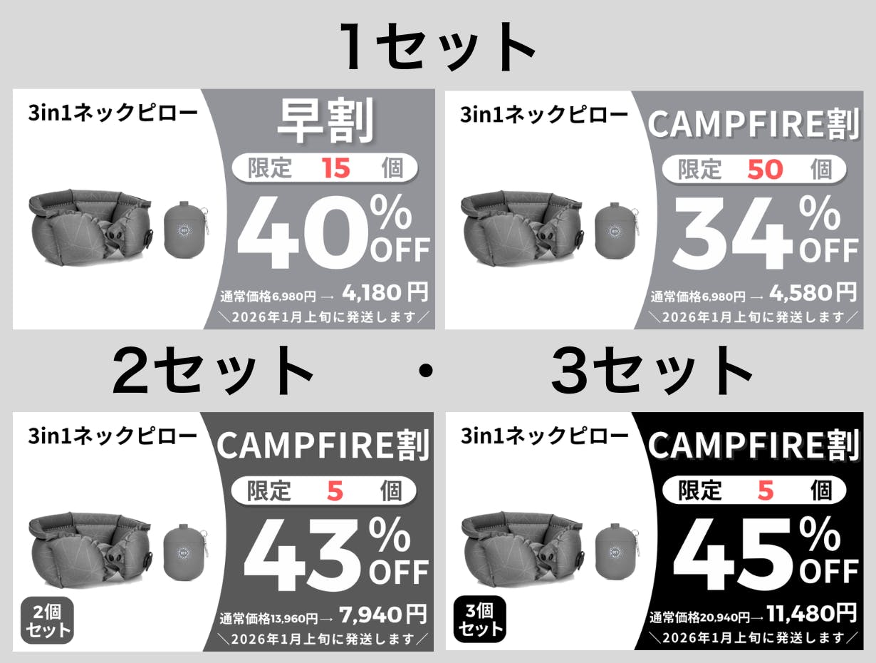2026/01/02 00:39ご支援者様、累計出荷数1万個◎どこでもポンプになるケースで20秒で膨らむ3in1ネックピローにご興味をお持ちいただきありがとうございます。プロジェクト開始から55日目で41ものご支援者の方々より支援頂き、無事プロジェクト終了を迎えることが出来ました。早速皆様のリターンを2026年01月末にお届けできるよう準備を始めております!皆様にご満足いただけるリターンをお届けできるよう、全力で取り組んで参りますので引き続き、「累計出荷数1万個◎どこでもポンプになるケースで20秒で膨らむ3in1ネックピロー」をよろしくお願い致します。BRIGHTチーム もっと見る