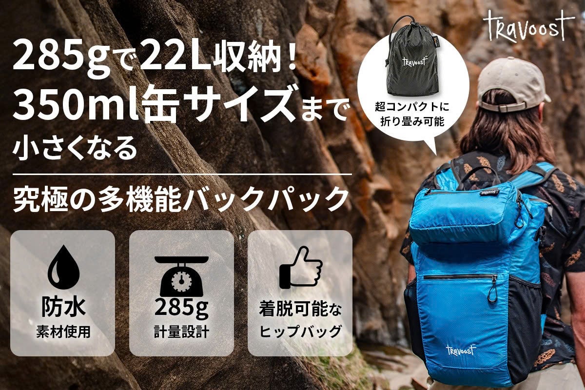 285gで22L収納!350ml缶サイズまで小さくなる究極の多機能バックパック