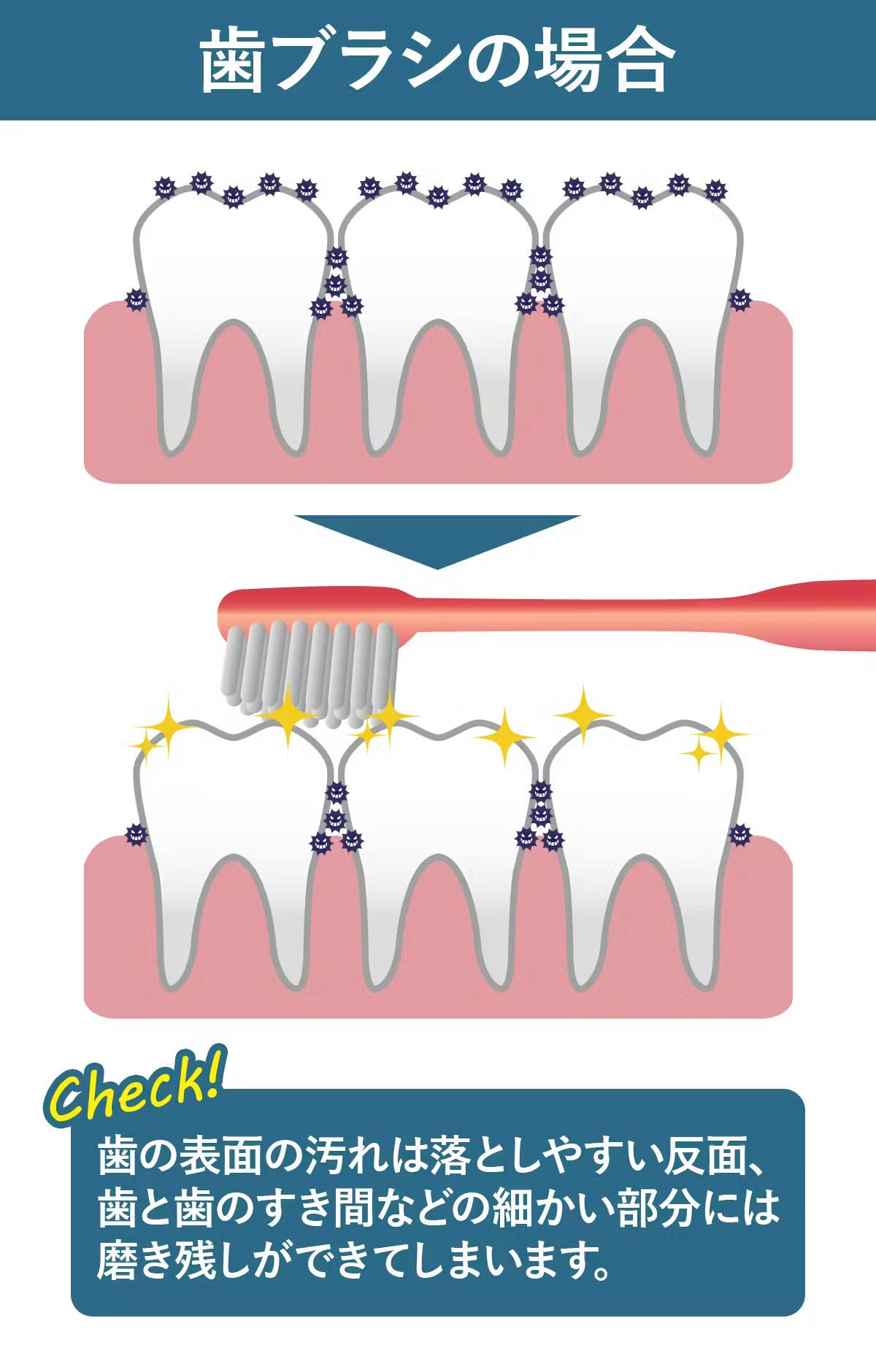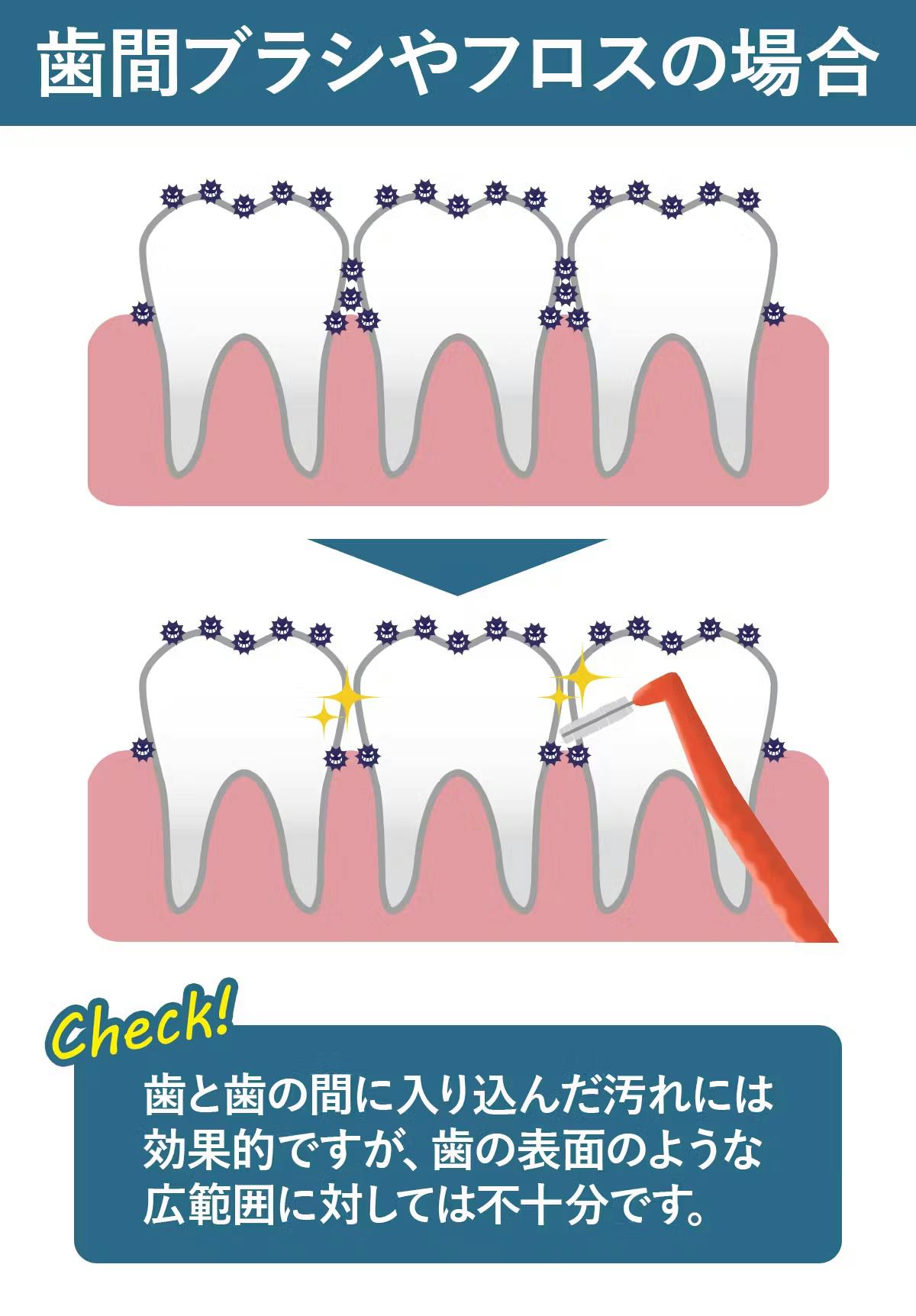 歯ブラシは日常のオーラルケアにおいてもっとも基本的なアイテムです。歯の表面に付着した汚れを落とすのにはとても有効で、磨いた部分はしっかりとキレイになります。しかし、歯と歯の間や歯ぐきの境目といった細かい部分には、磨き残しができやすいのが難点です。とくに奥歯の奥や歯と歯の隙間にはブラシの毛先が届きにくく、細菌の温床になりがちです。