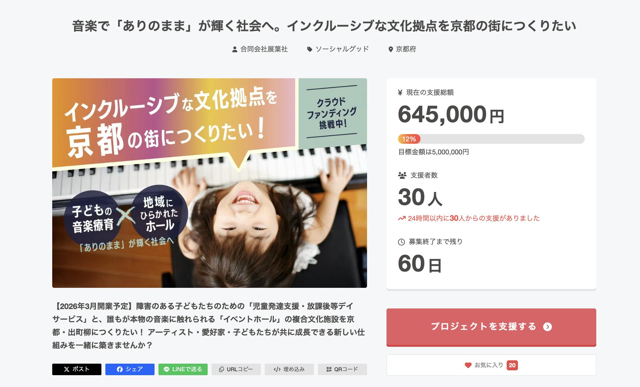 おかげさまで、現時点で30人もの方にご支援いただき、64万5,000円、目標の12%のサポートが集まっています。